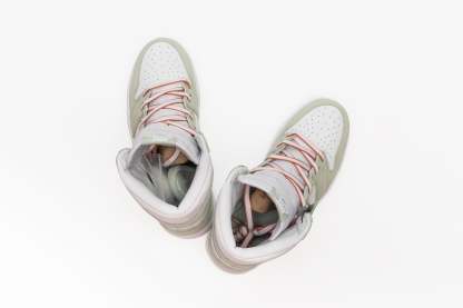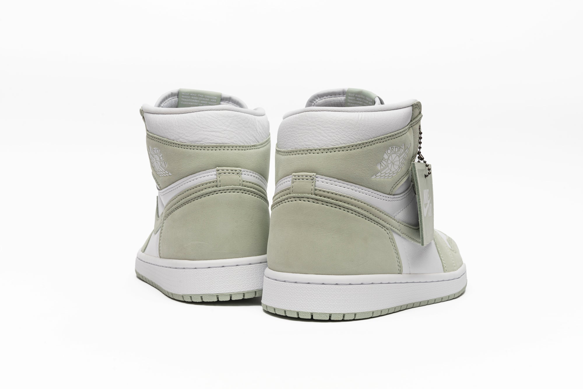 The women's Air Jordan 1 High Seafoam (W) arrives in a smooth white leather construction with Seafoam Durabuck overlays and Swooshes