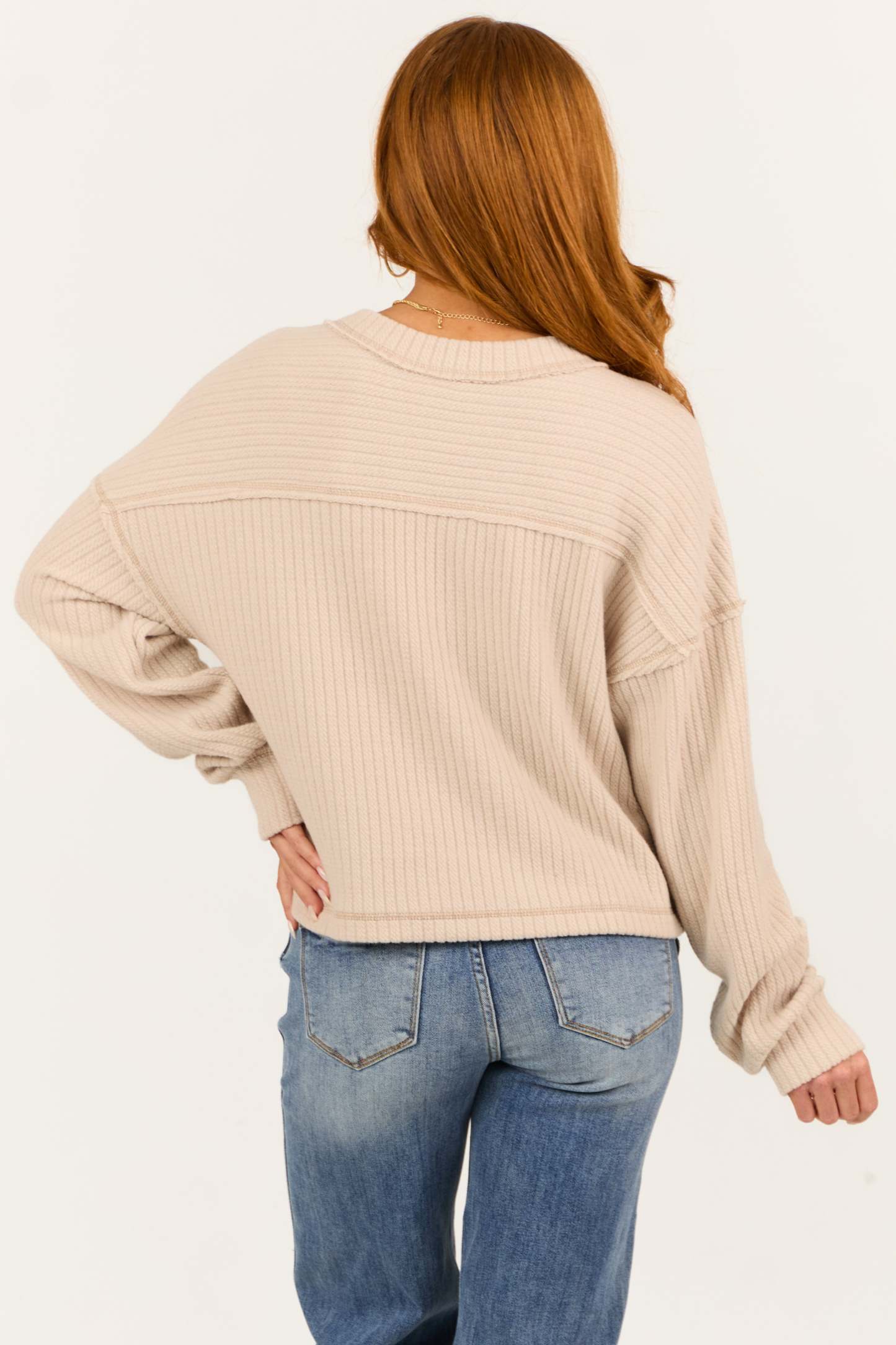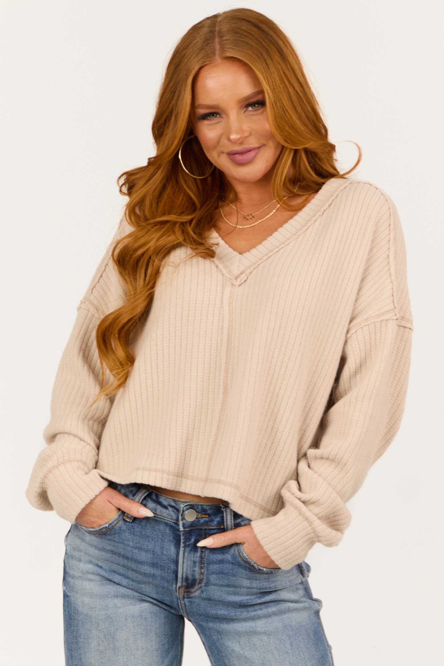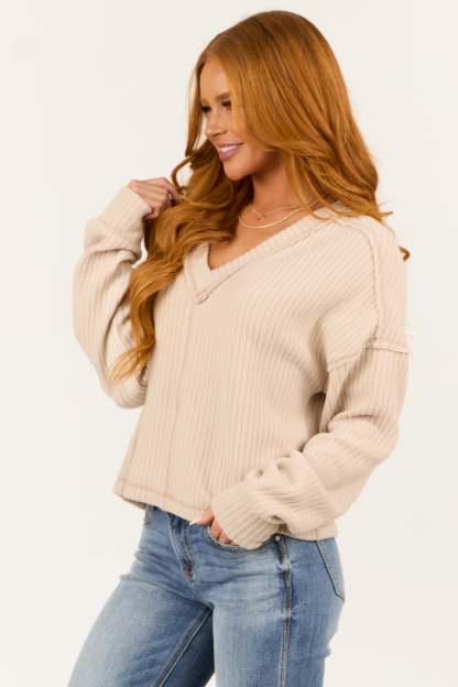 Almond V Neck Exposed Seam Ribbed Sweater