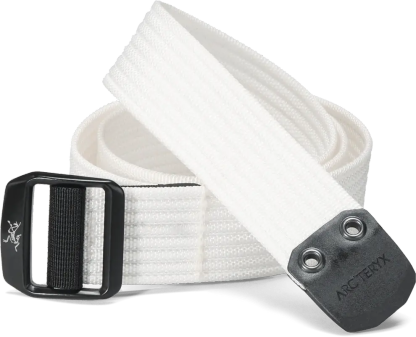 Arc'teryx's wider heavy-duty webbing belt features a metal buckle with an Arc'teryx logo.