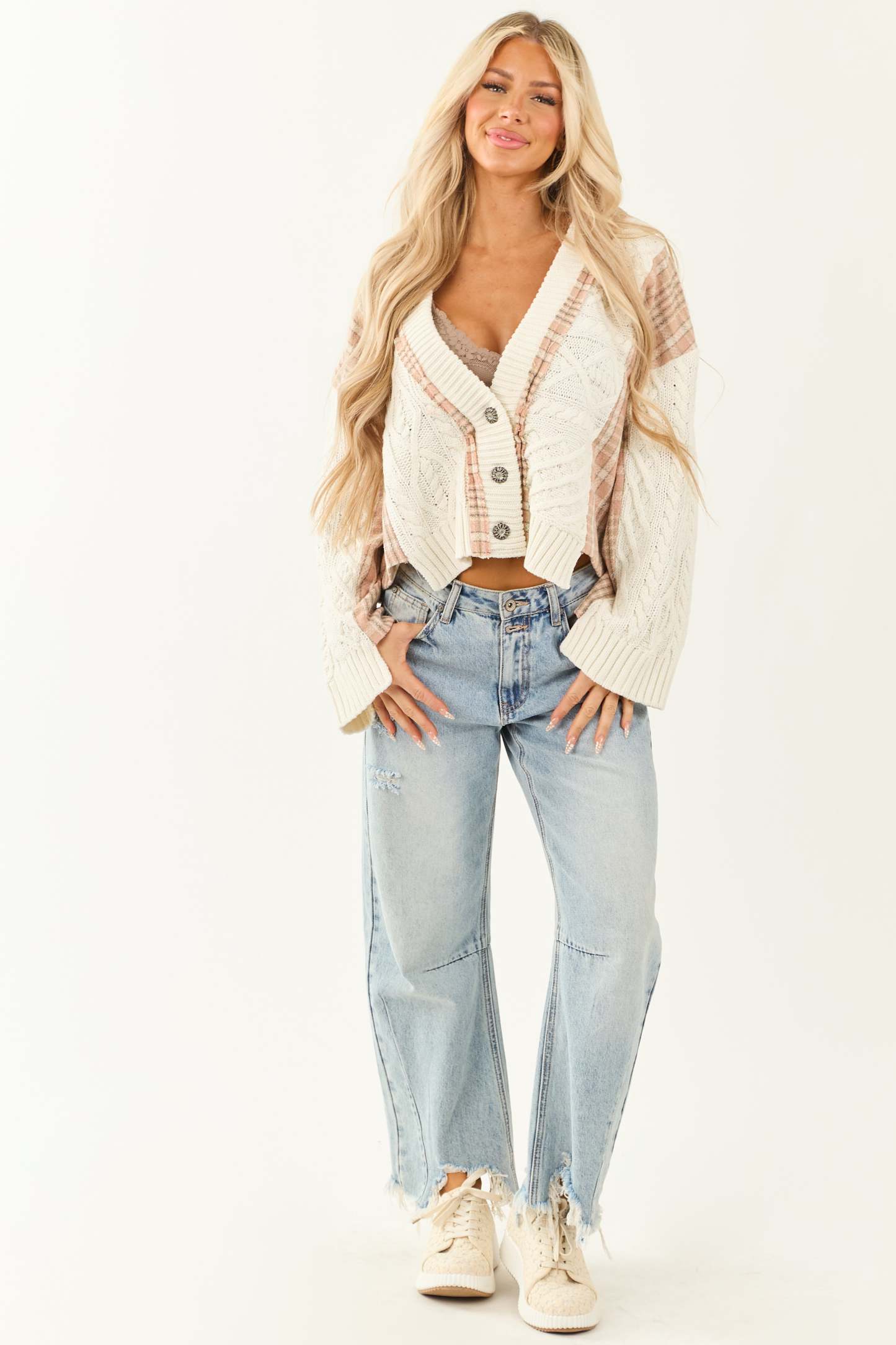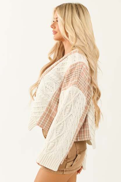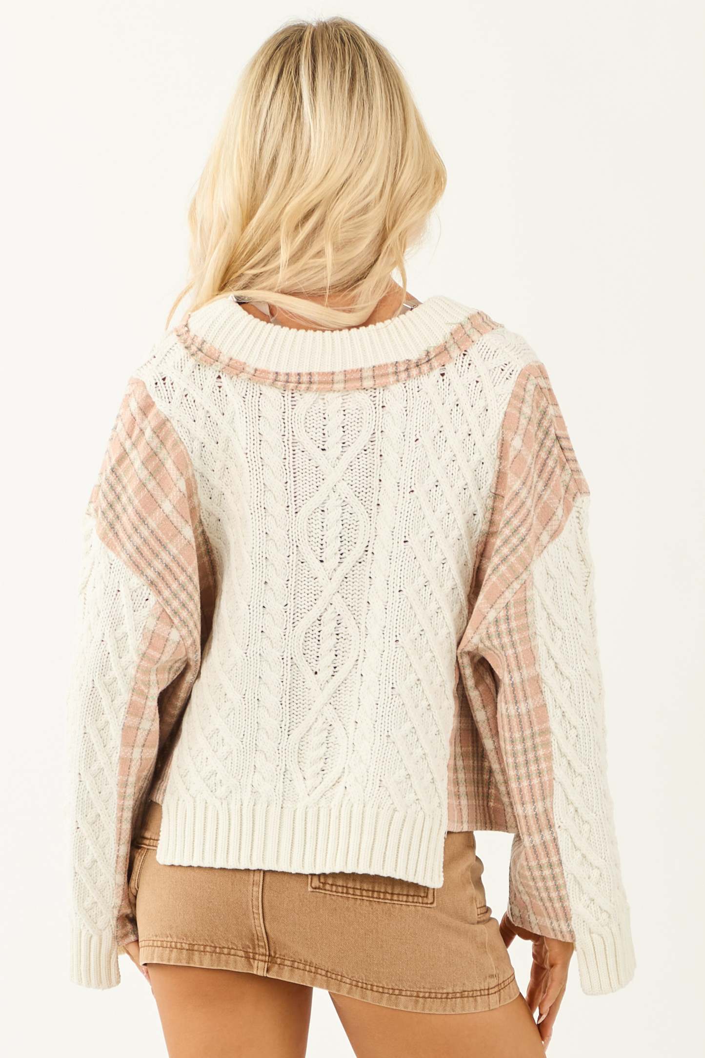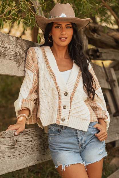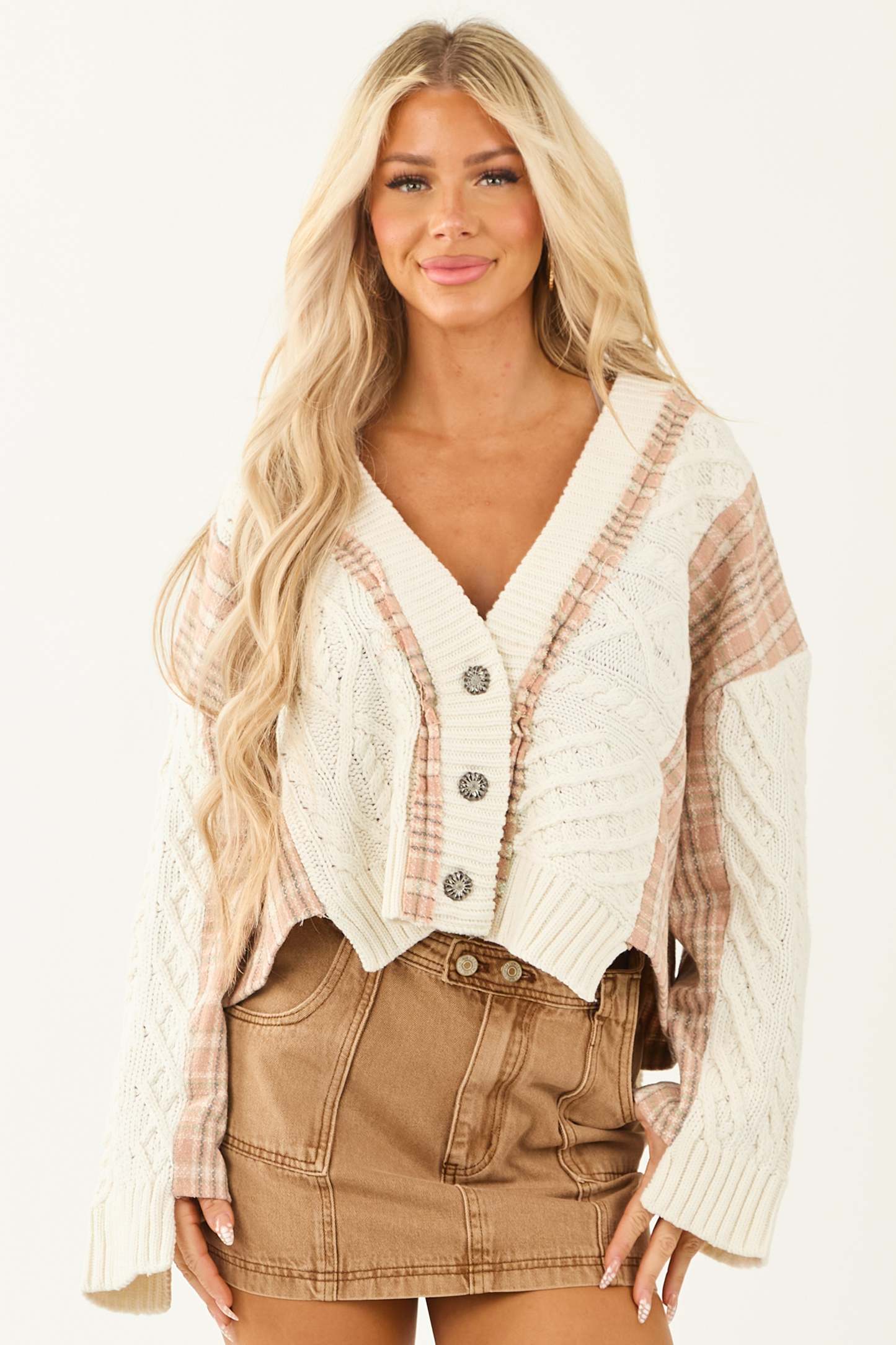 Ivory Cable Knit Plaid Contrast Button Up Cardigan