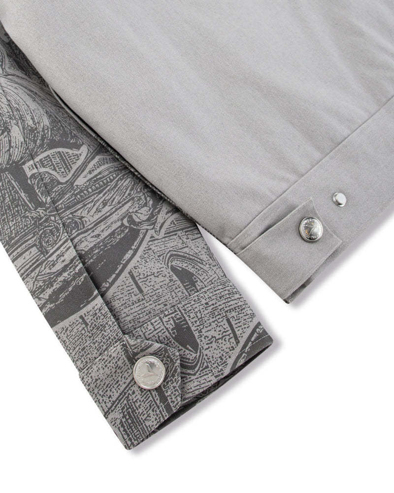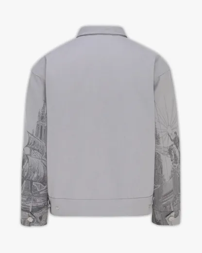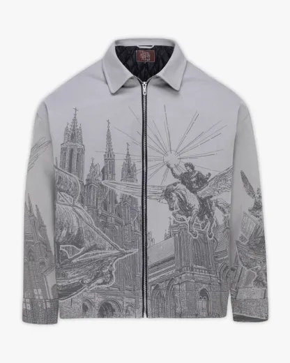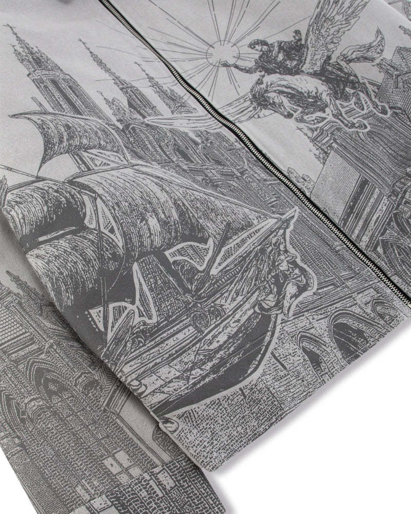 Crafted from grey cotton canvas, this jacket features a striking print of Hercules riding a winged horse through a mythological skyline.signature hardware and functional waist adjusters complete the piece with subtle luxury.