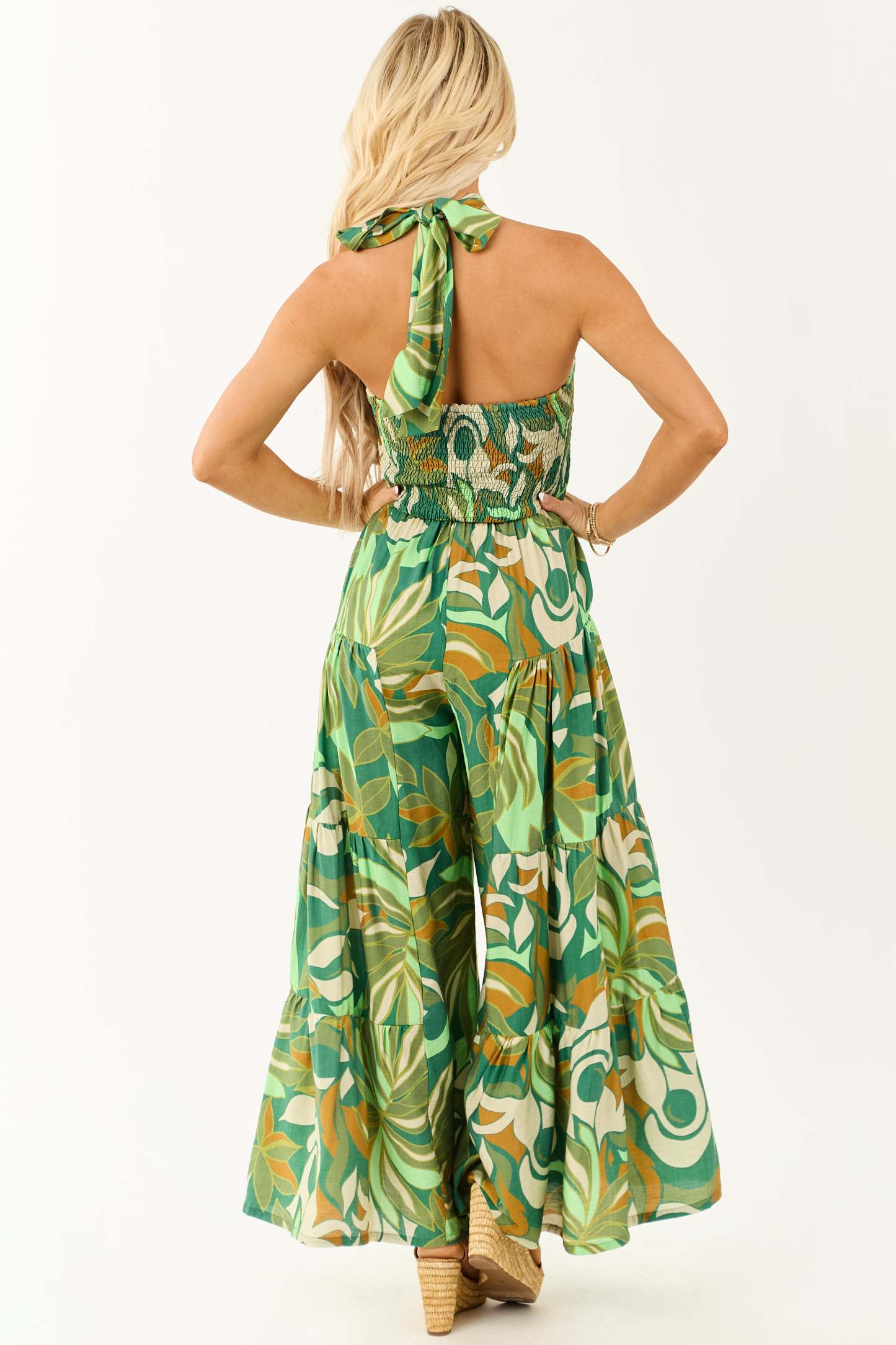 - Look fresh and fierce with this tiered palazzo leg tropical jumpsuit. Bold, breezy, and made for sunset dinners and beach getaways.