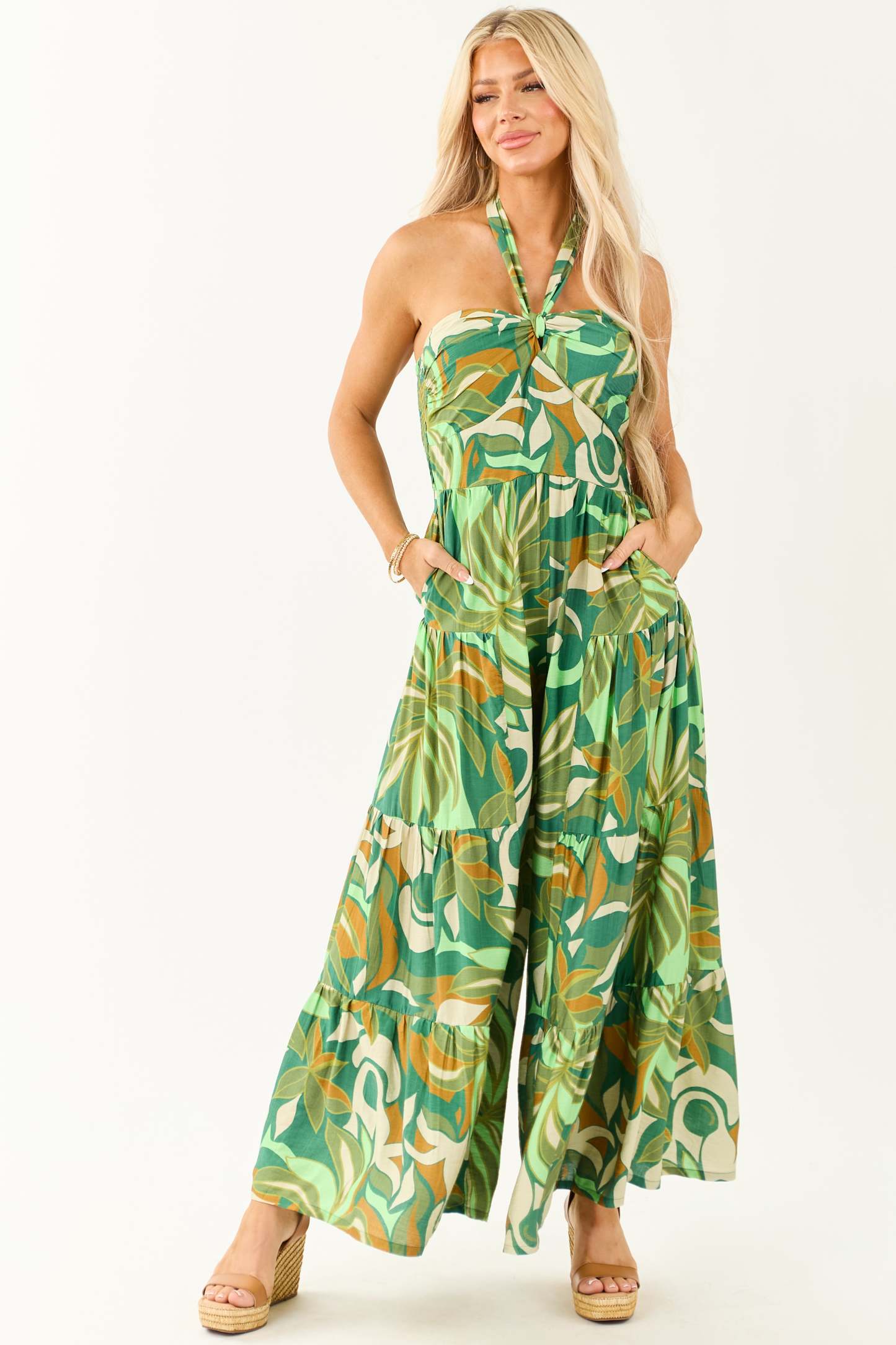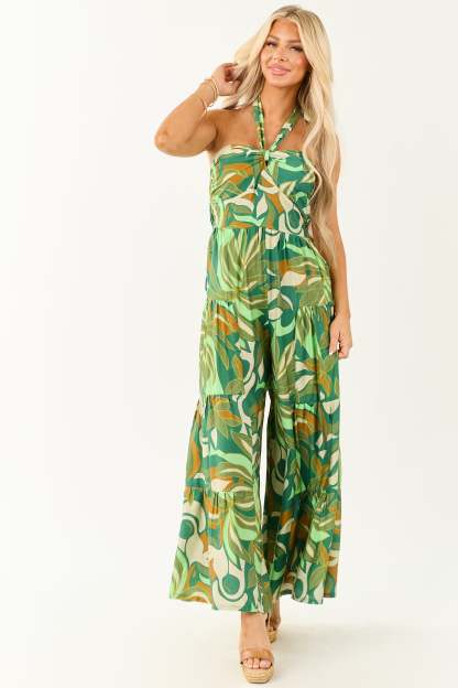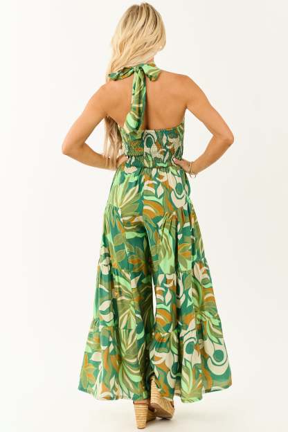 Kiwi Tropical Print Halter Front Tie Jumpsuit