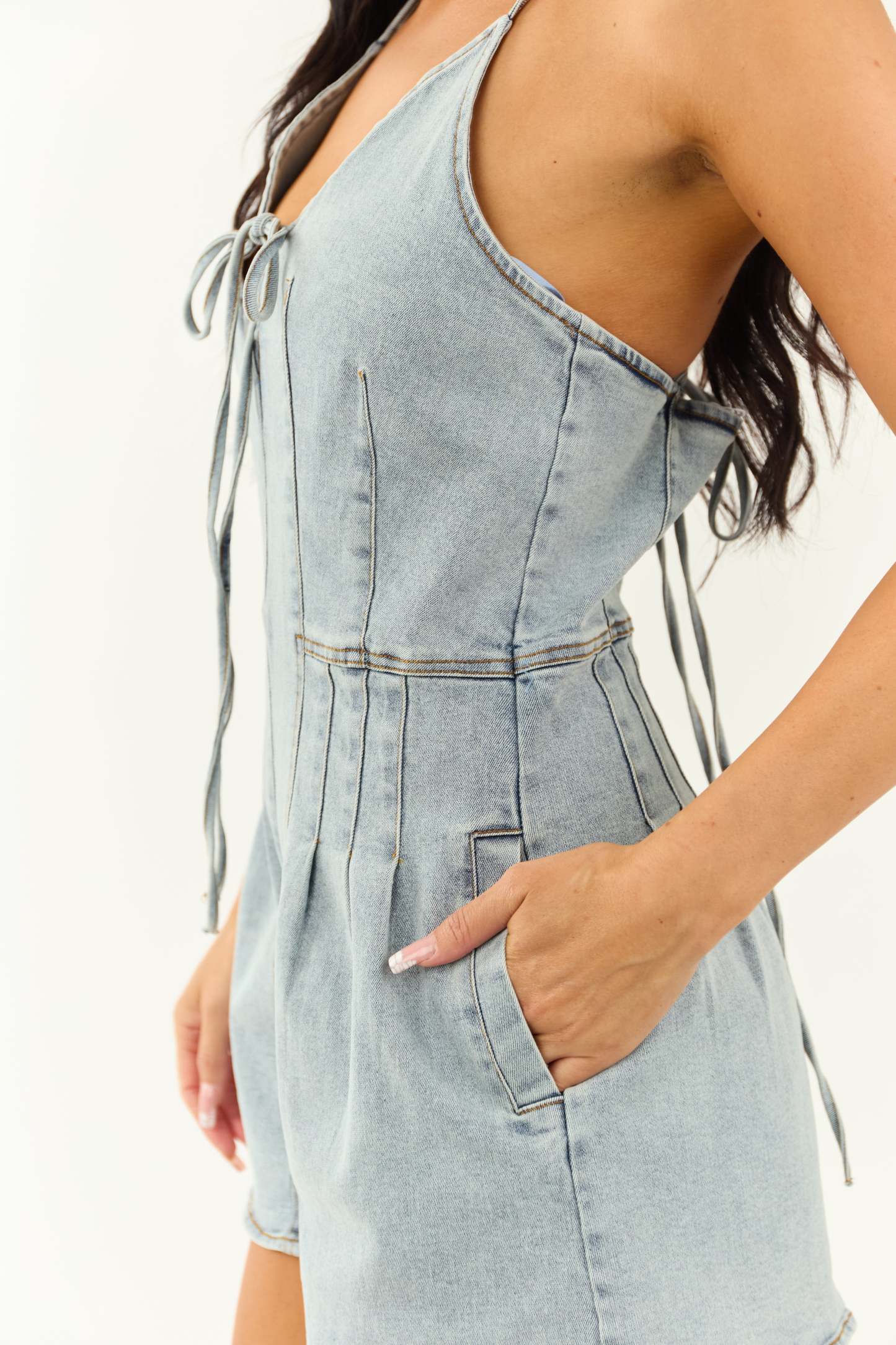 Light Wash Deep V Neck Sleeveless Denim Romper
