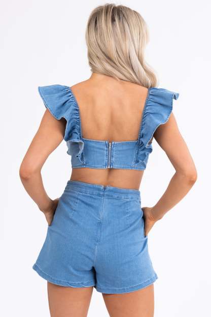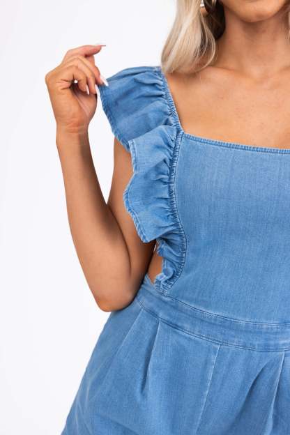 - Flirty with an edge, this lightweight denim romper features a ruffled cap overlay and a stunning open back for that perfect day-to-night vibe.