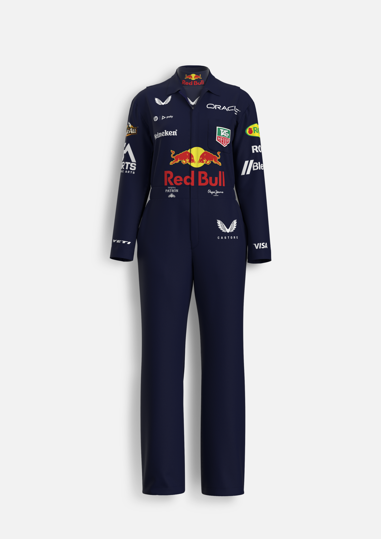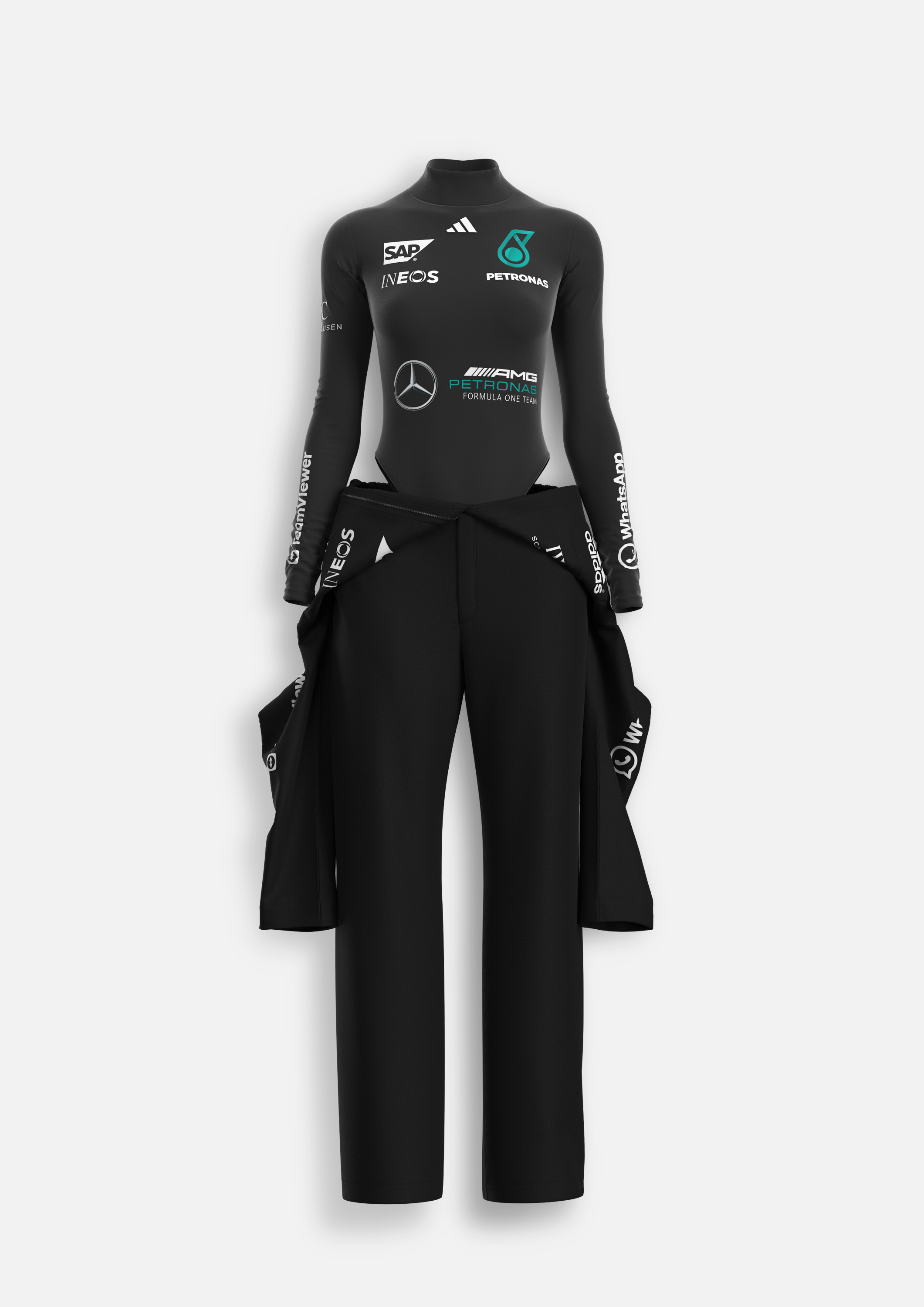 - Body-contouring bodysuit with motorsport-inspired details
