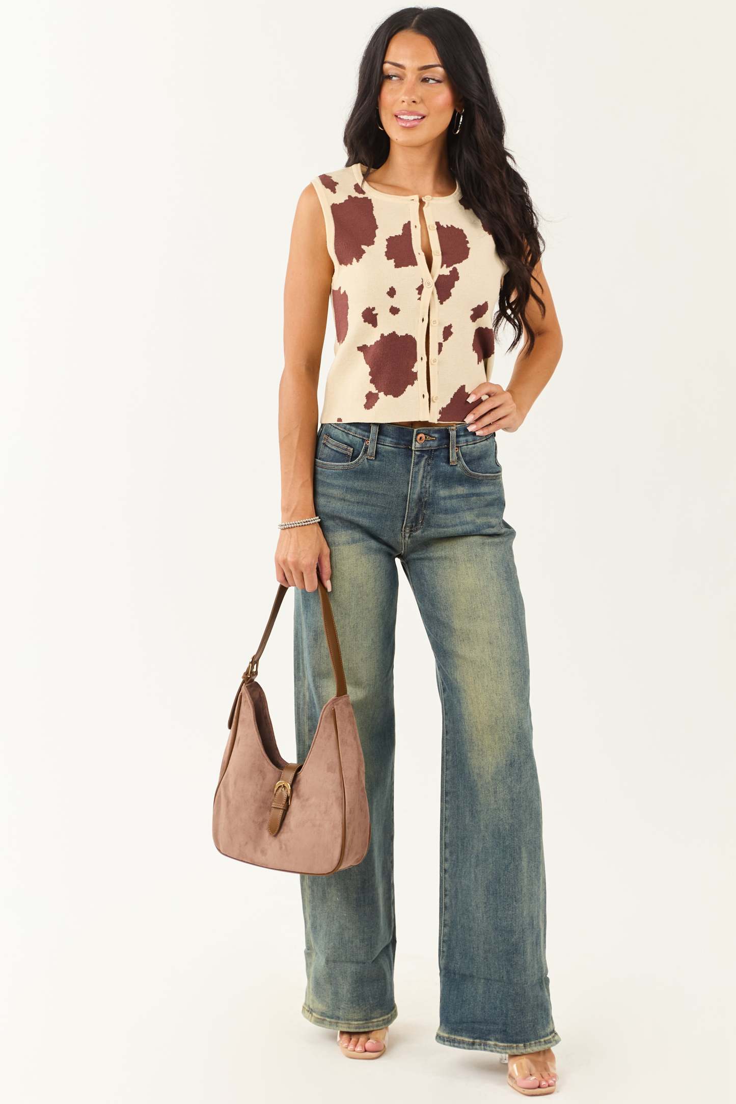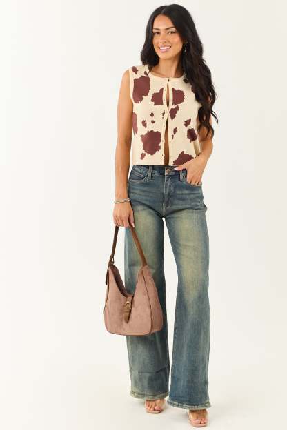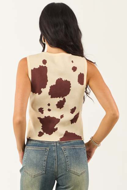 Sand Cow Print Button Down Sweater Tank Top