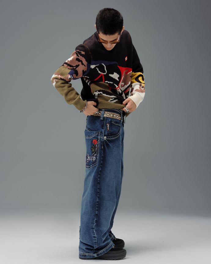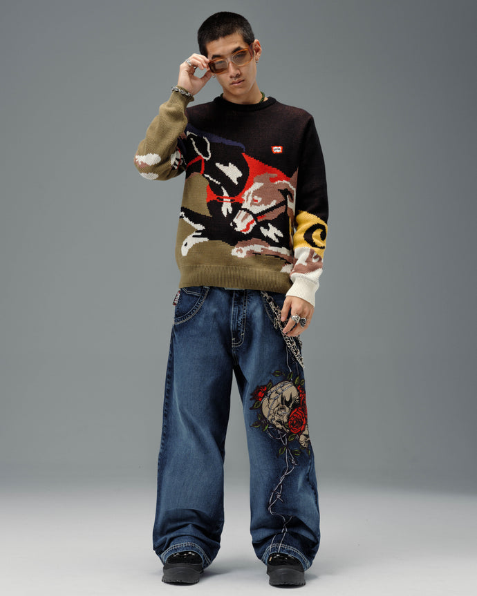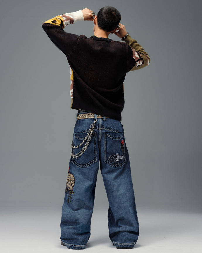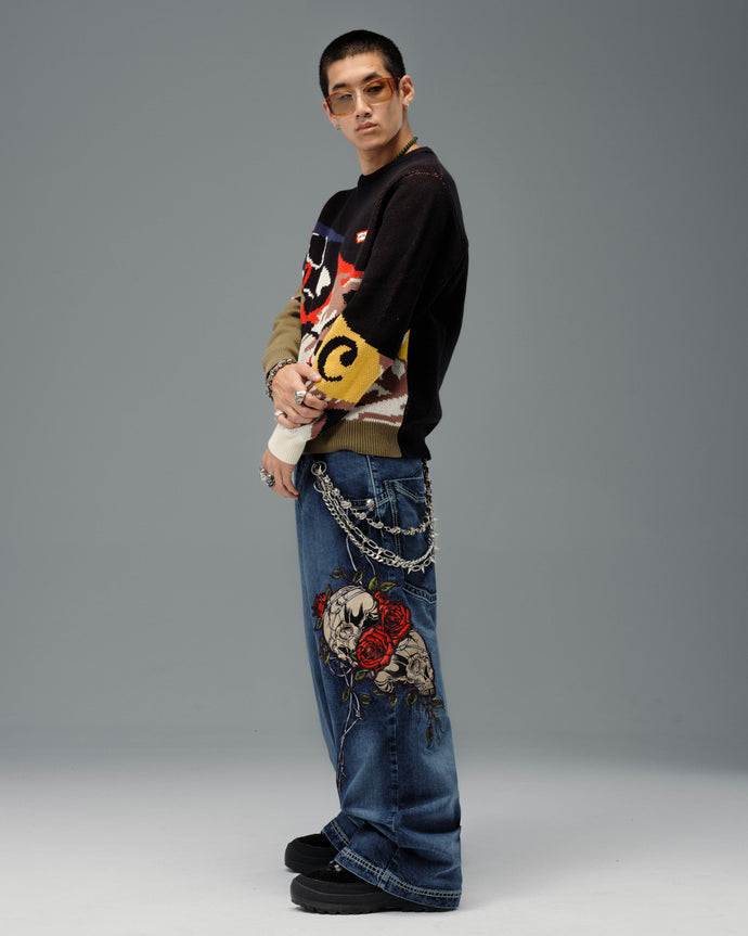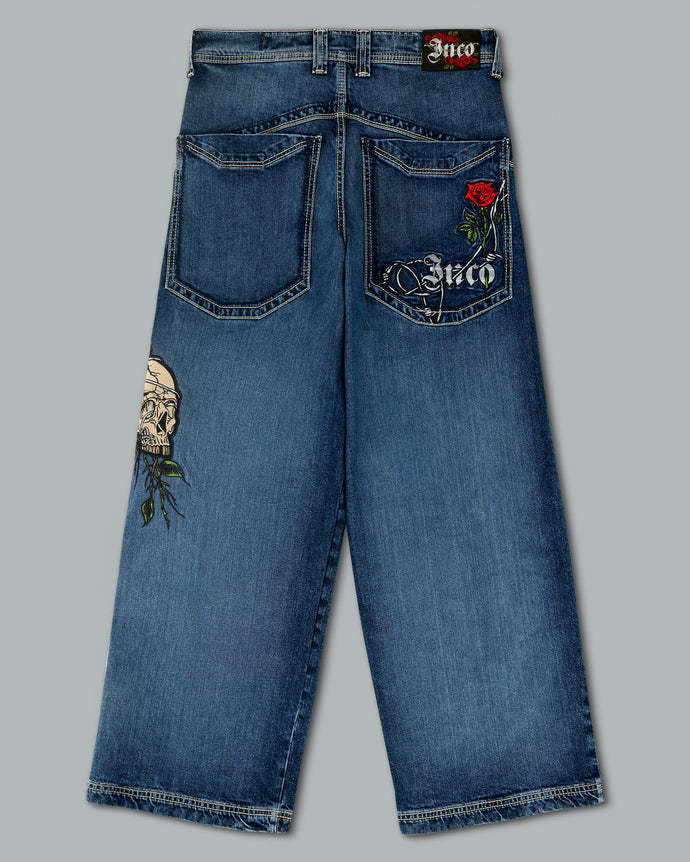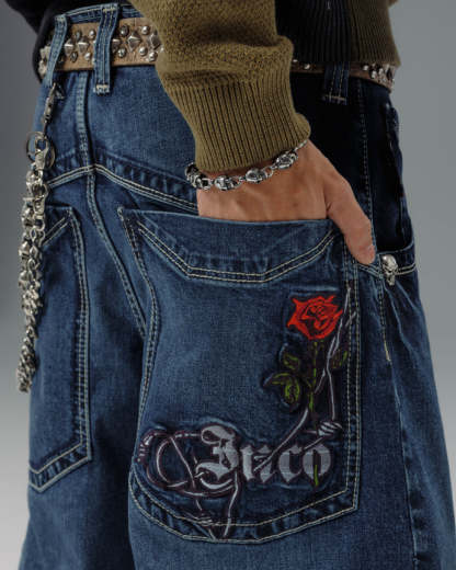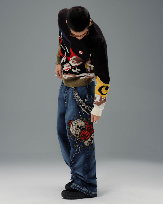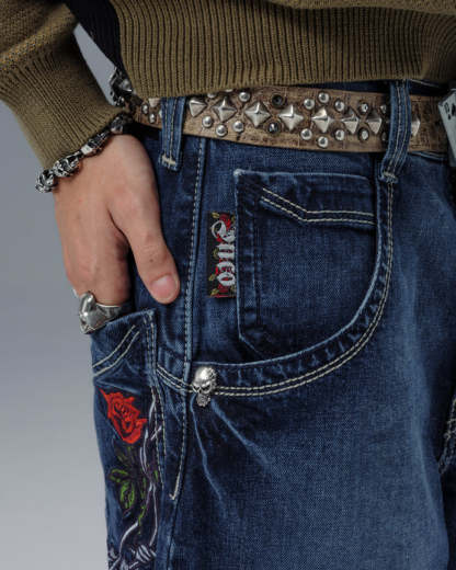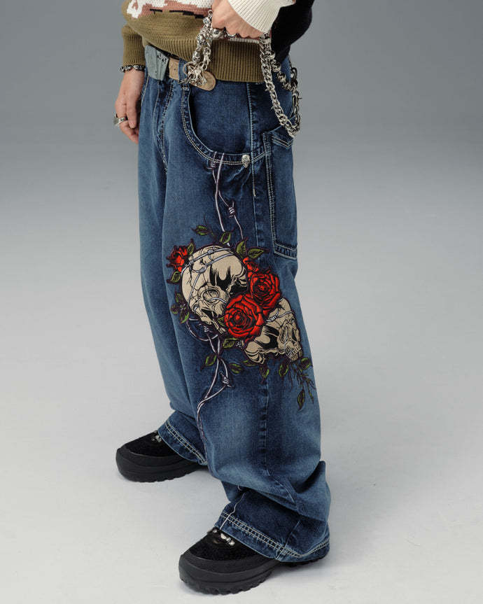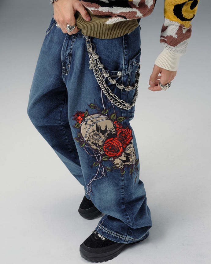 Original patches and original embroidery, featuring a detailed skull wrapped in blooming red roses and twisted barbed wire, stitched with over 200,000 layered threads.