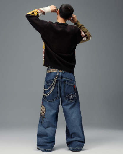 24" bottom opening, contrast stitching, and custom skull and jewel hardware.