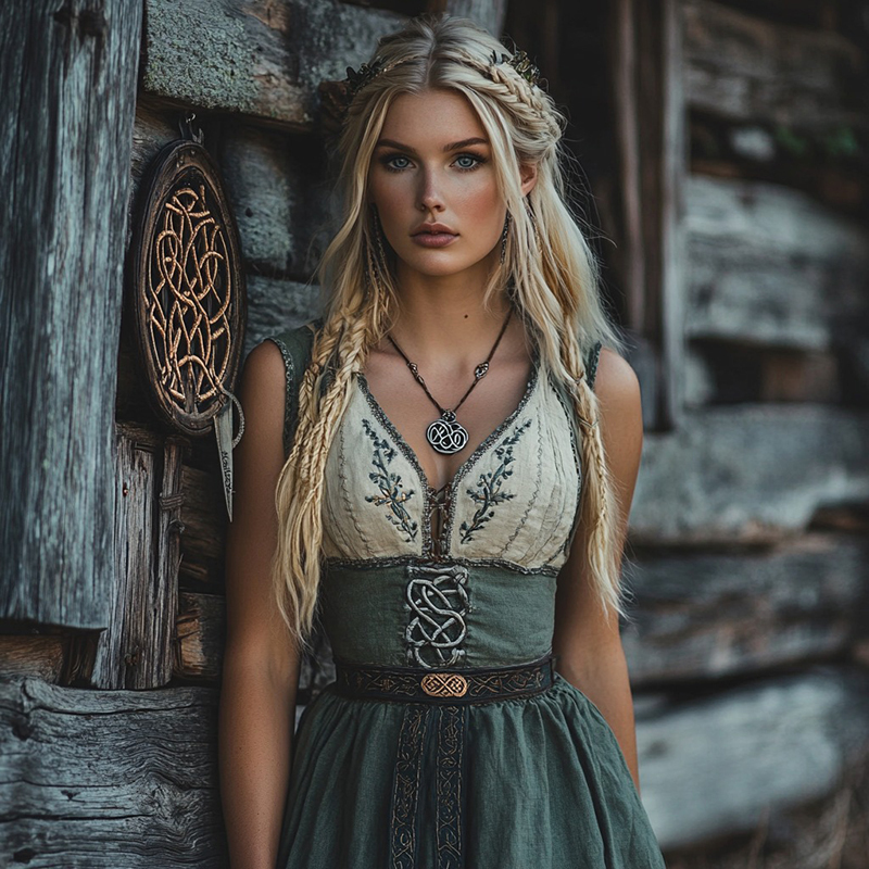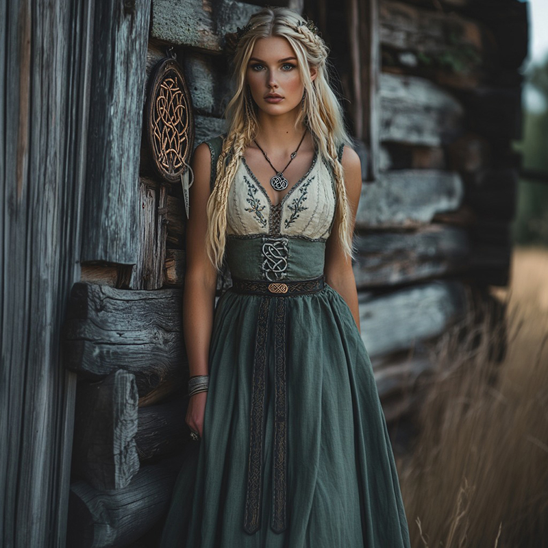 Vintage Viking Celtic Knot Plant Embroidery Design Linen Suspender Maxi Dress