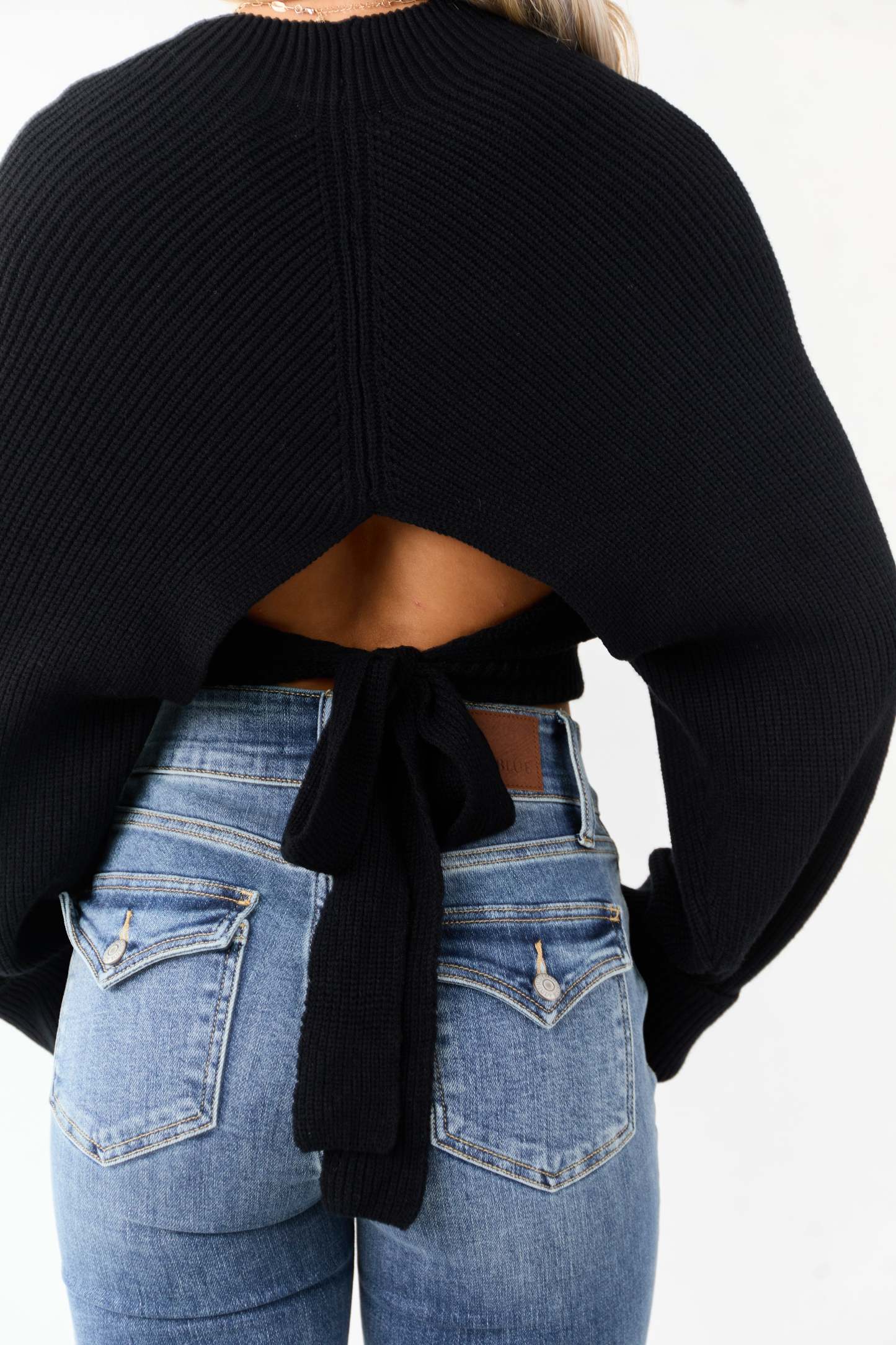 - A chic mock neck sweater with a flirty back cutout and tie detail for a modern, versatile look.