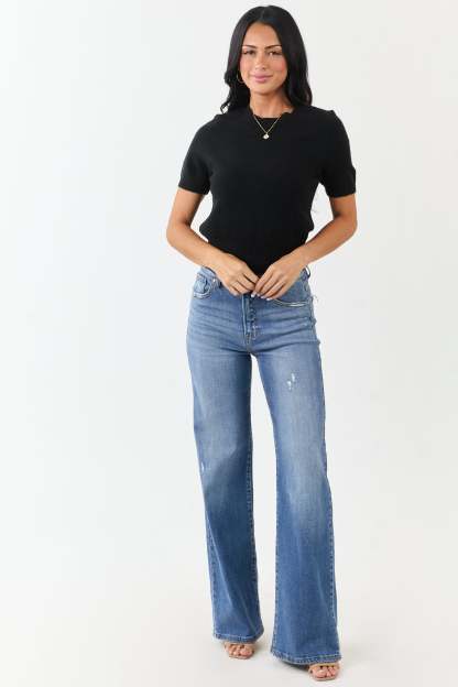 Medium Wash Chambray Tiered Lace Trim Mini Dress