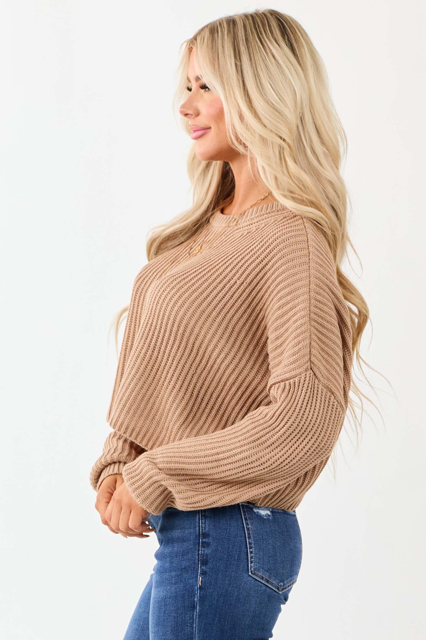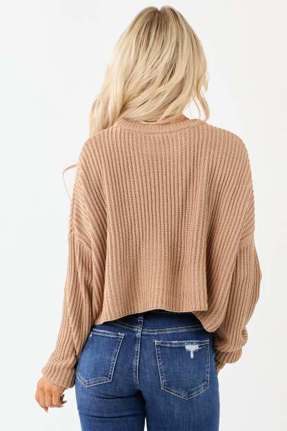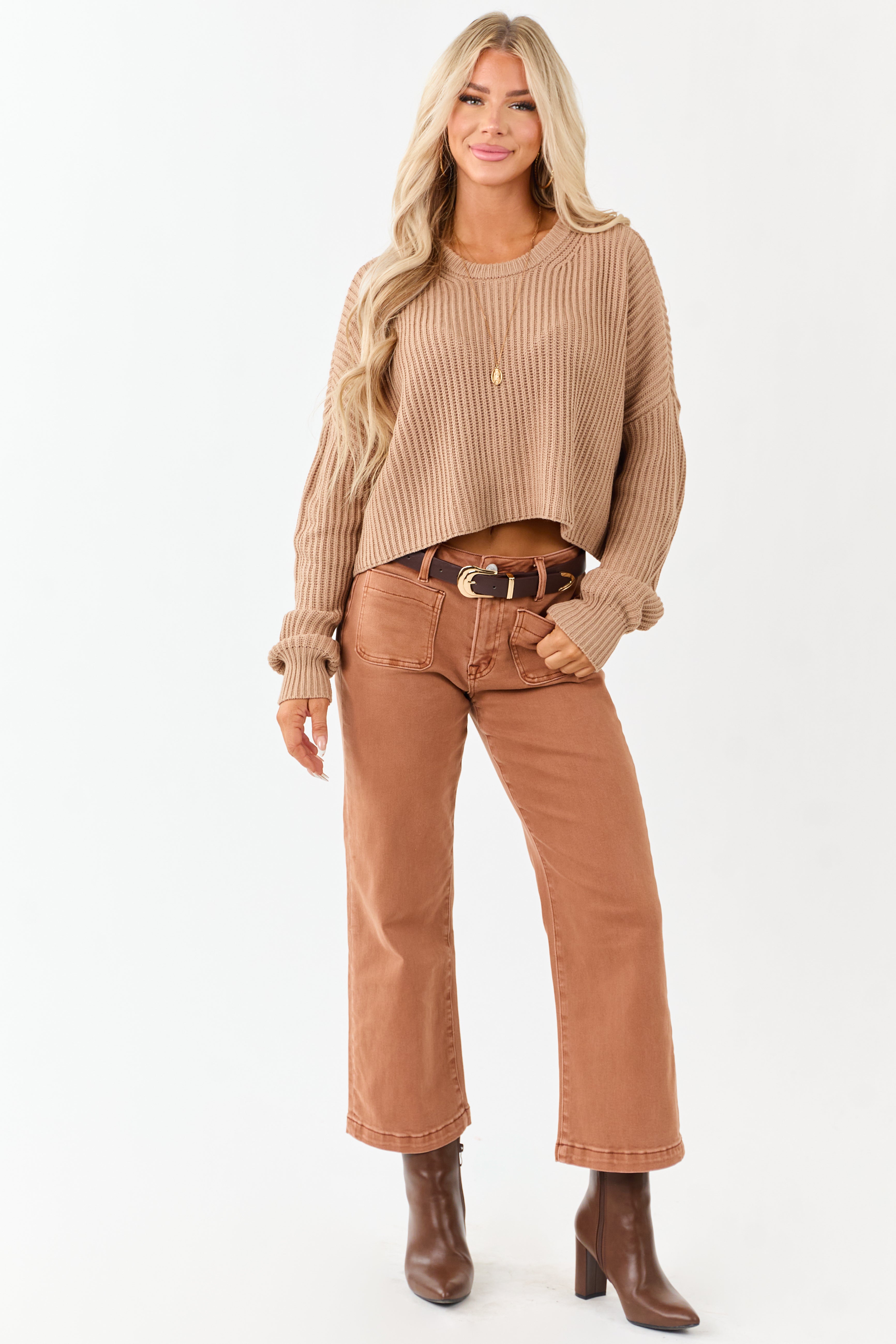 Camel Relaxed Rib Knit Crew Neck Cropped Sweater