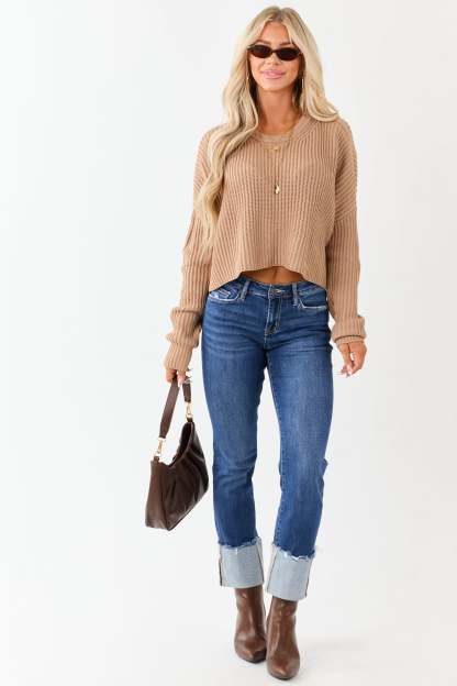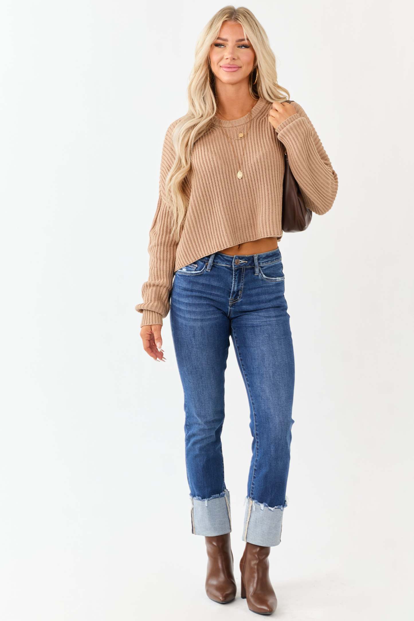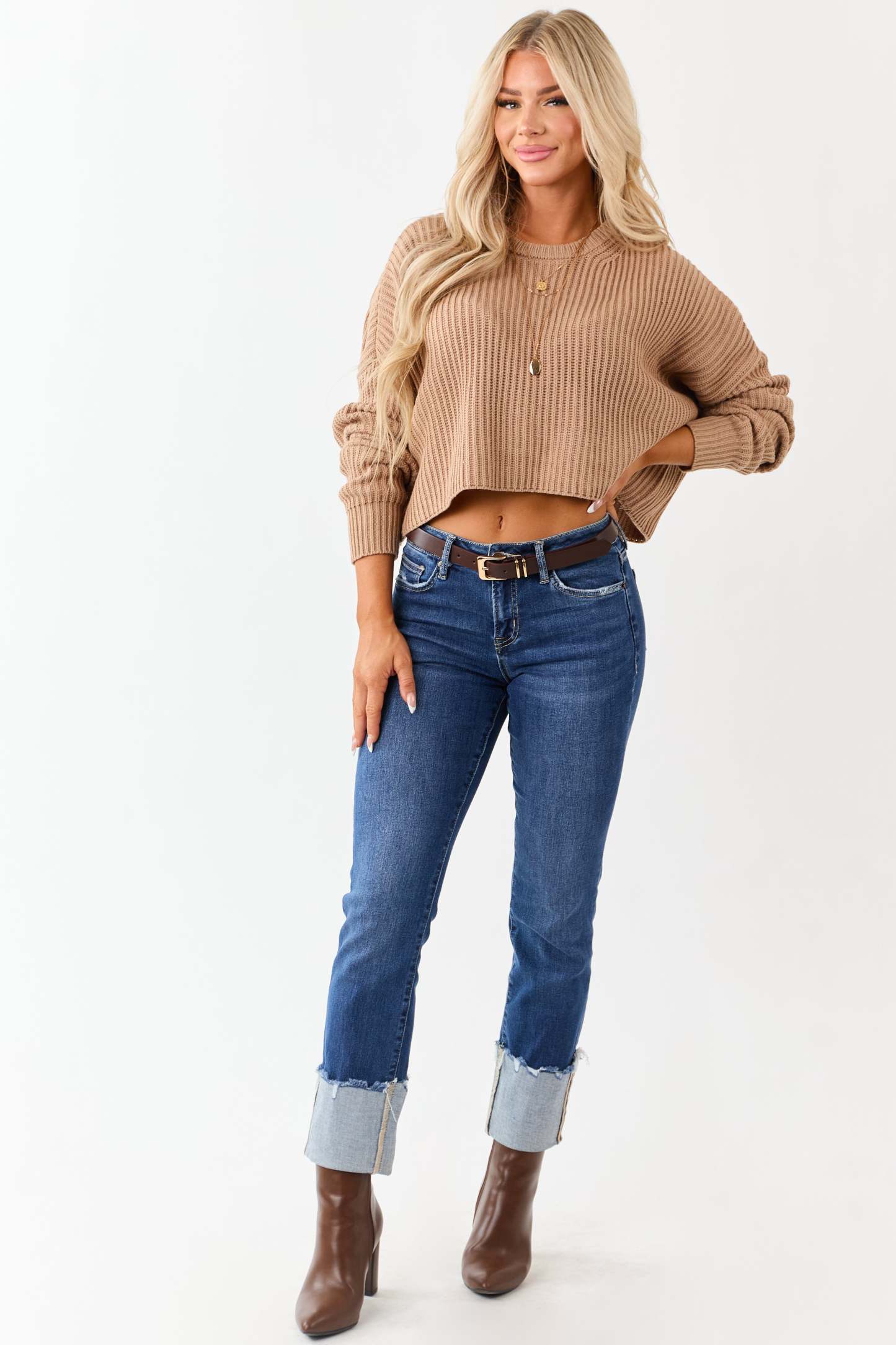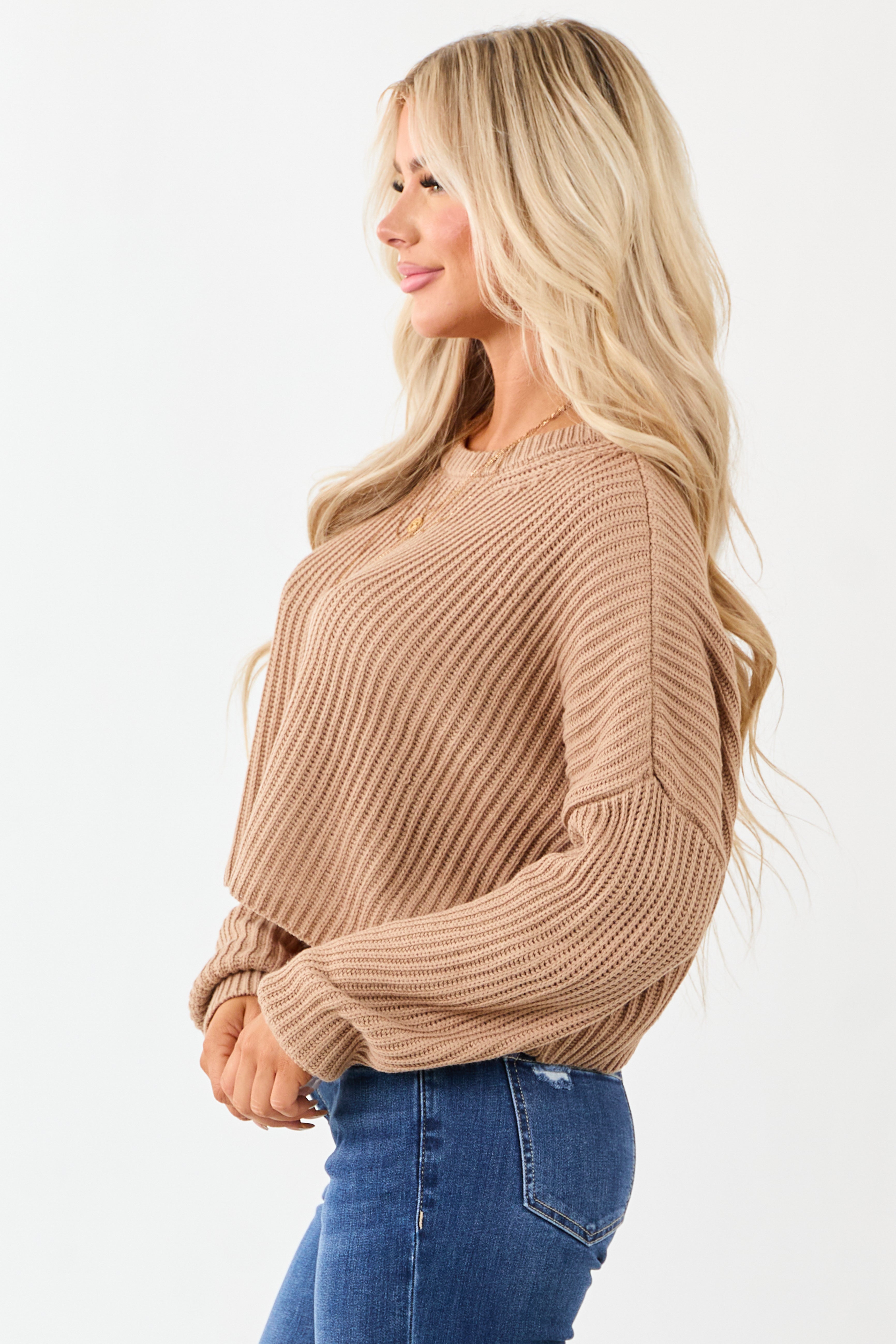 Camel Relaxed Rib Knit Crew Neck Cropped Sweater