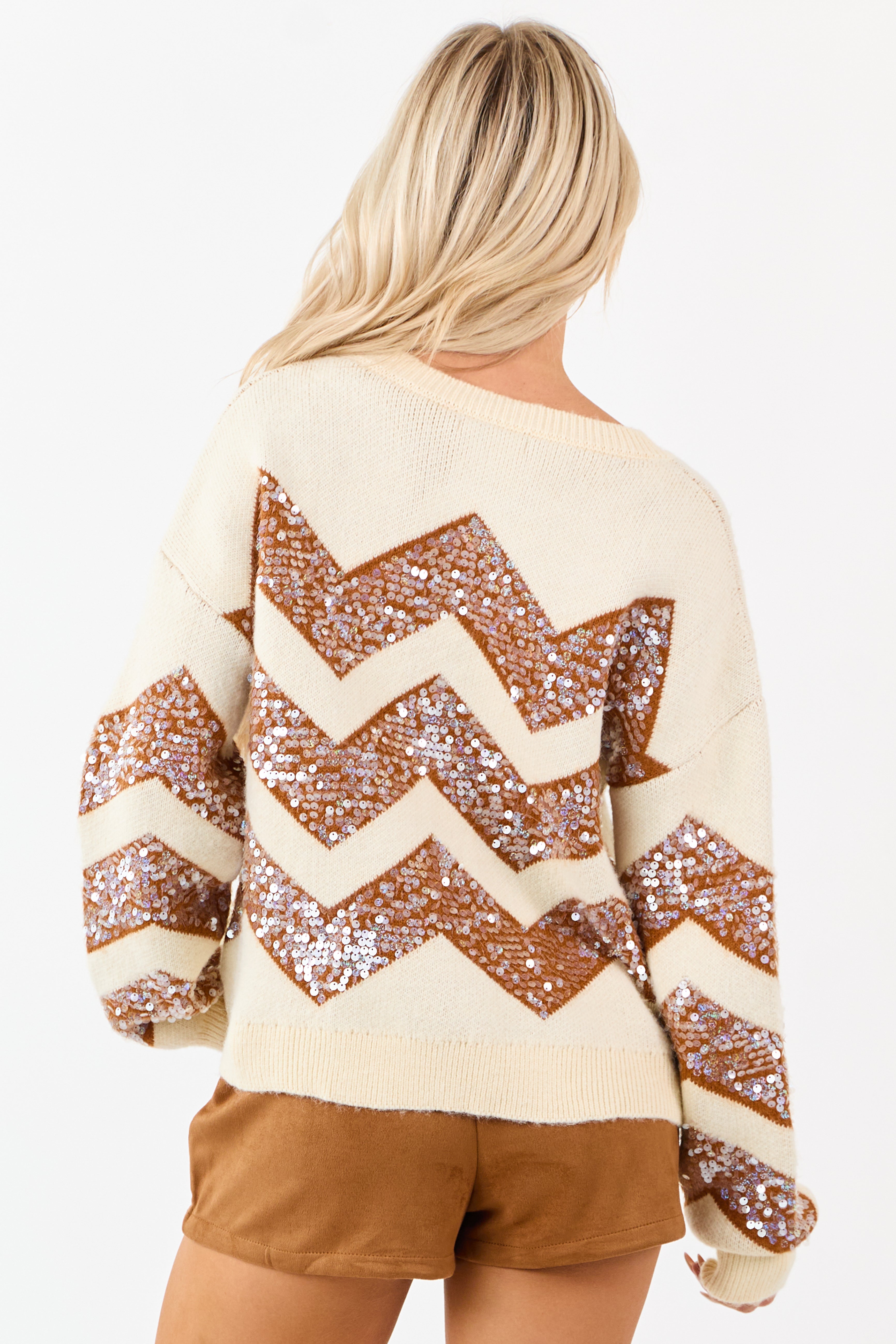 Cream and Sepia Chevron Sequined Knit Sweater