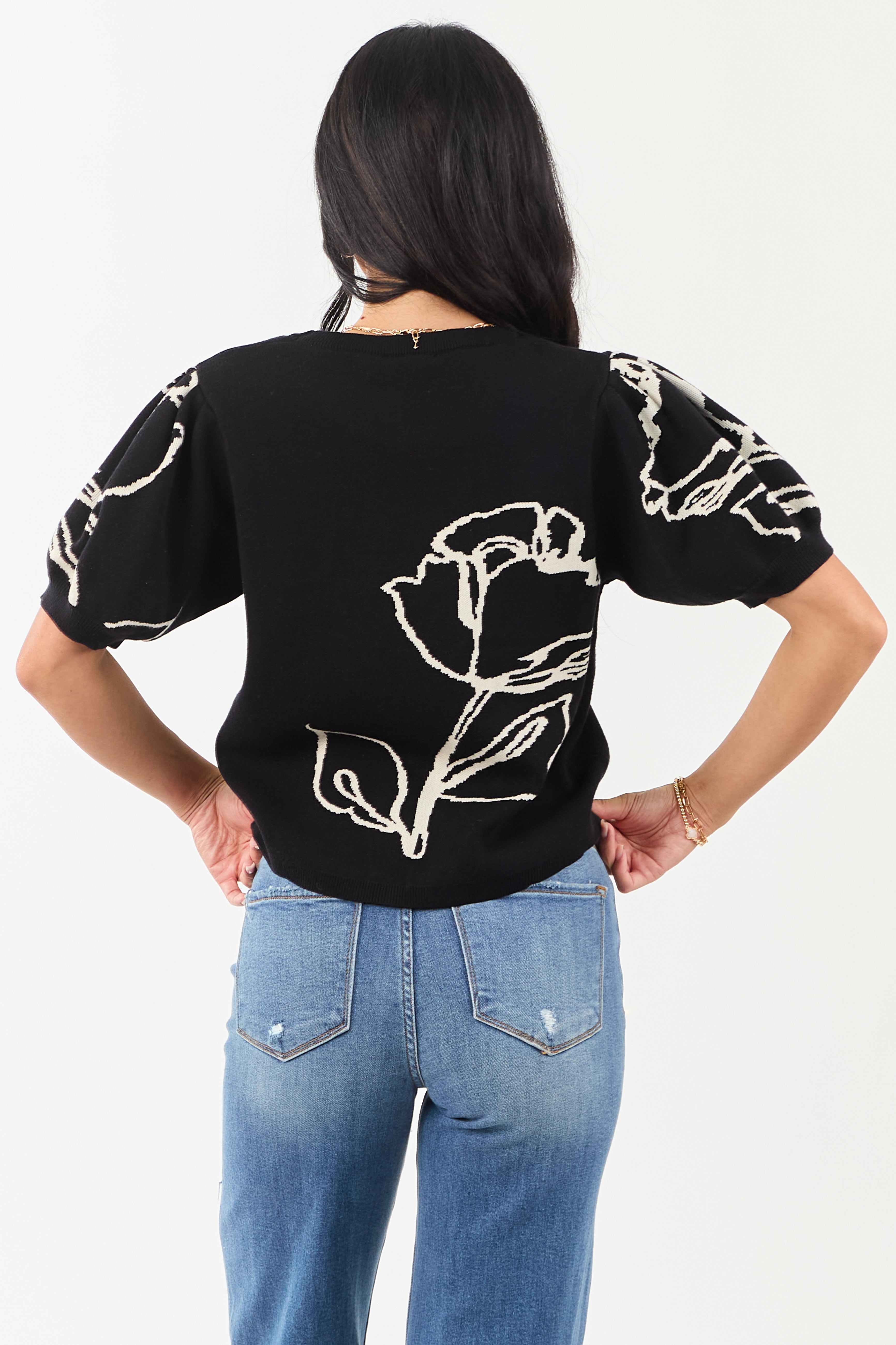 Entro Black Rose Graphic Puff Sleeve Sweater Top