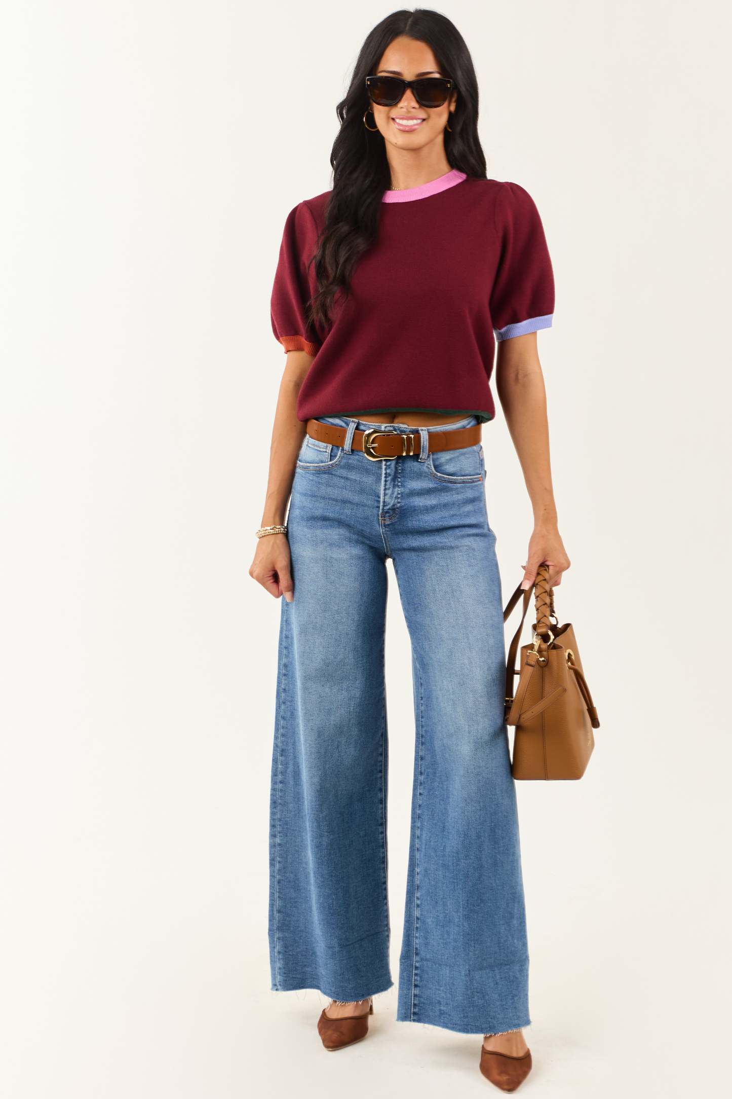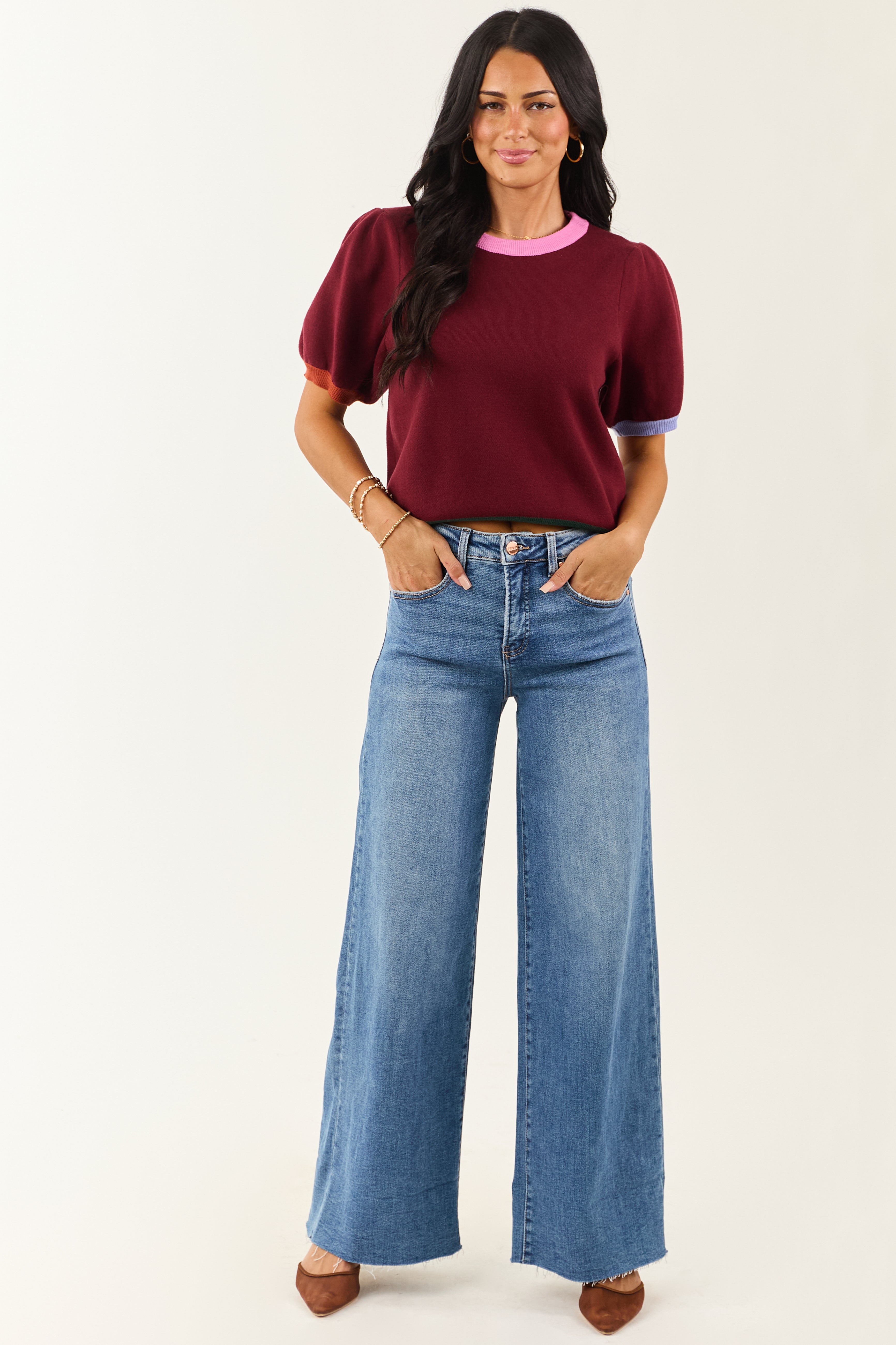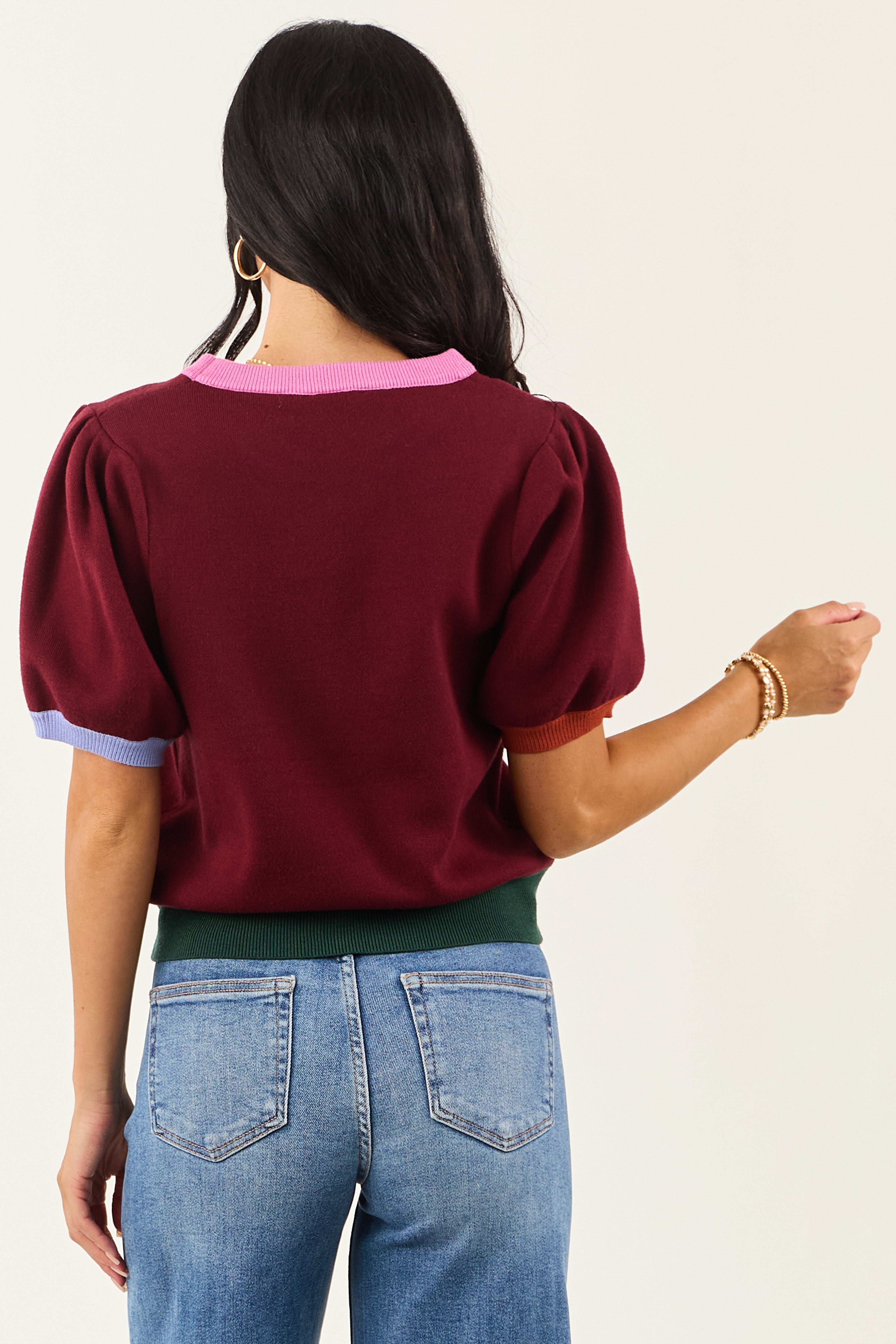Entro Burgundy Colorblock Puff Sleeve Sweater Top