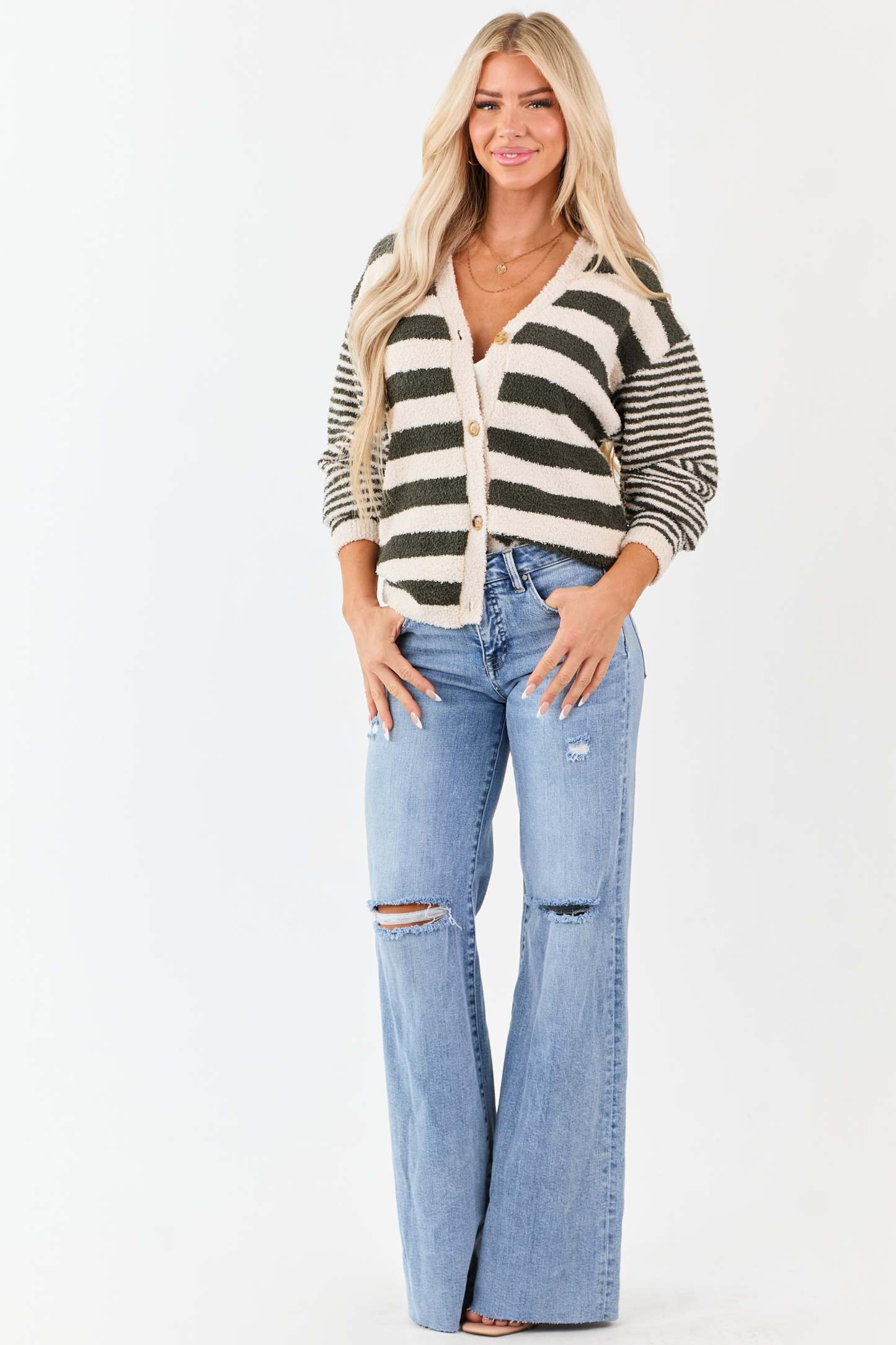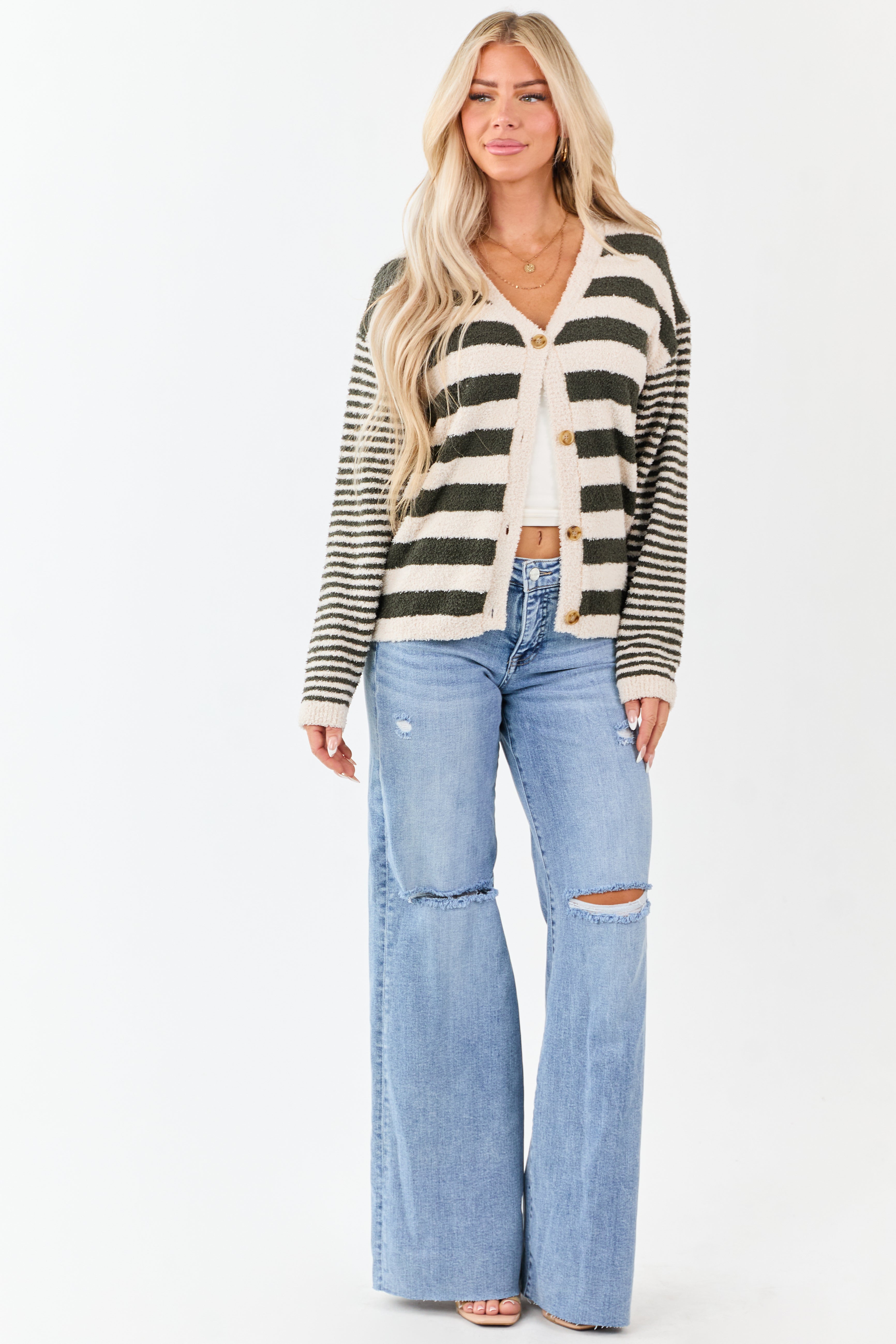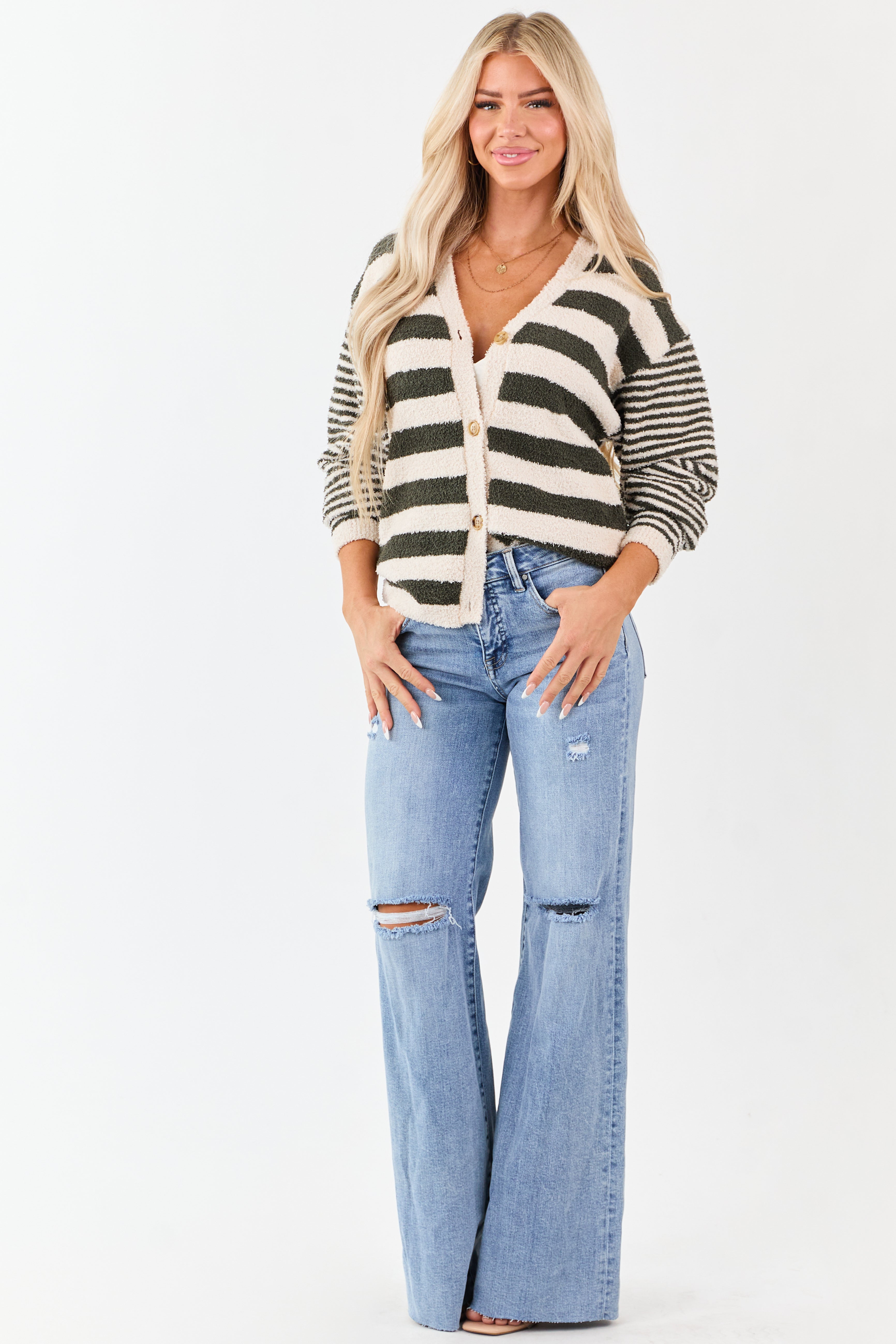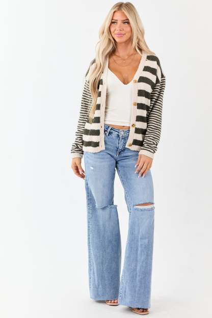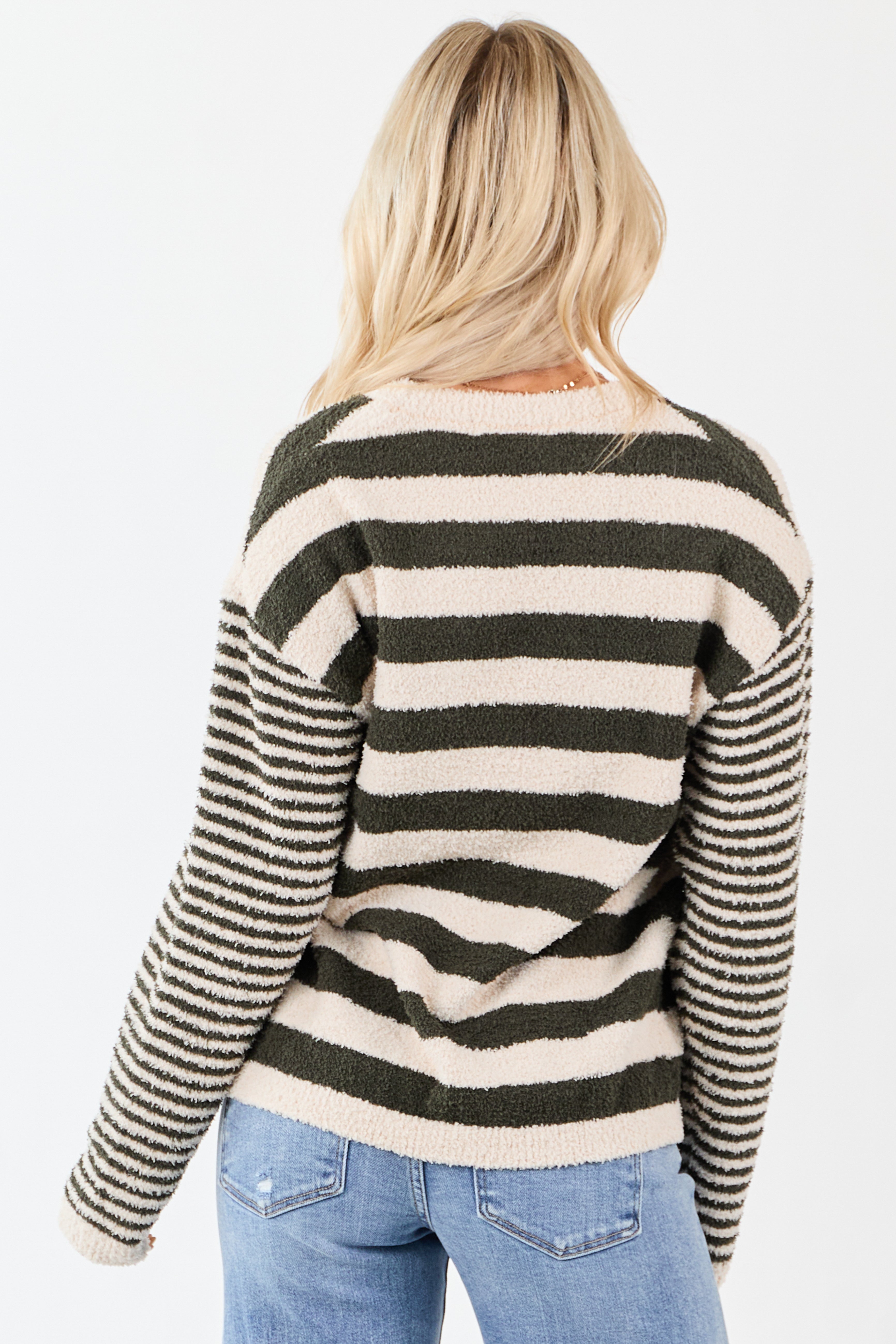 Forest Green Striped Button Down Fuzzy Knit Cardigan