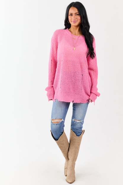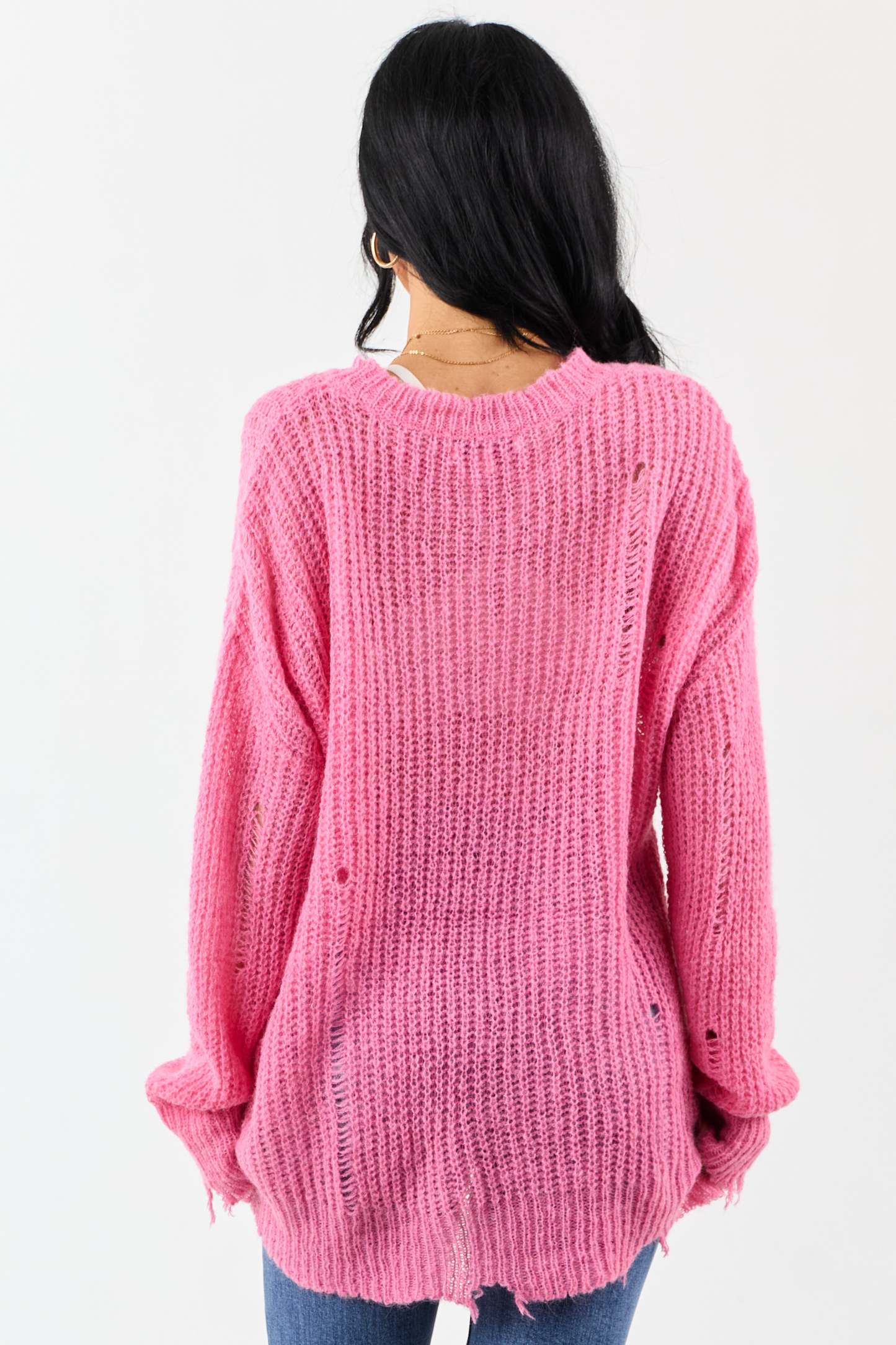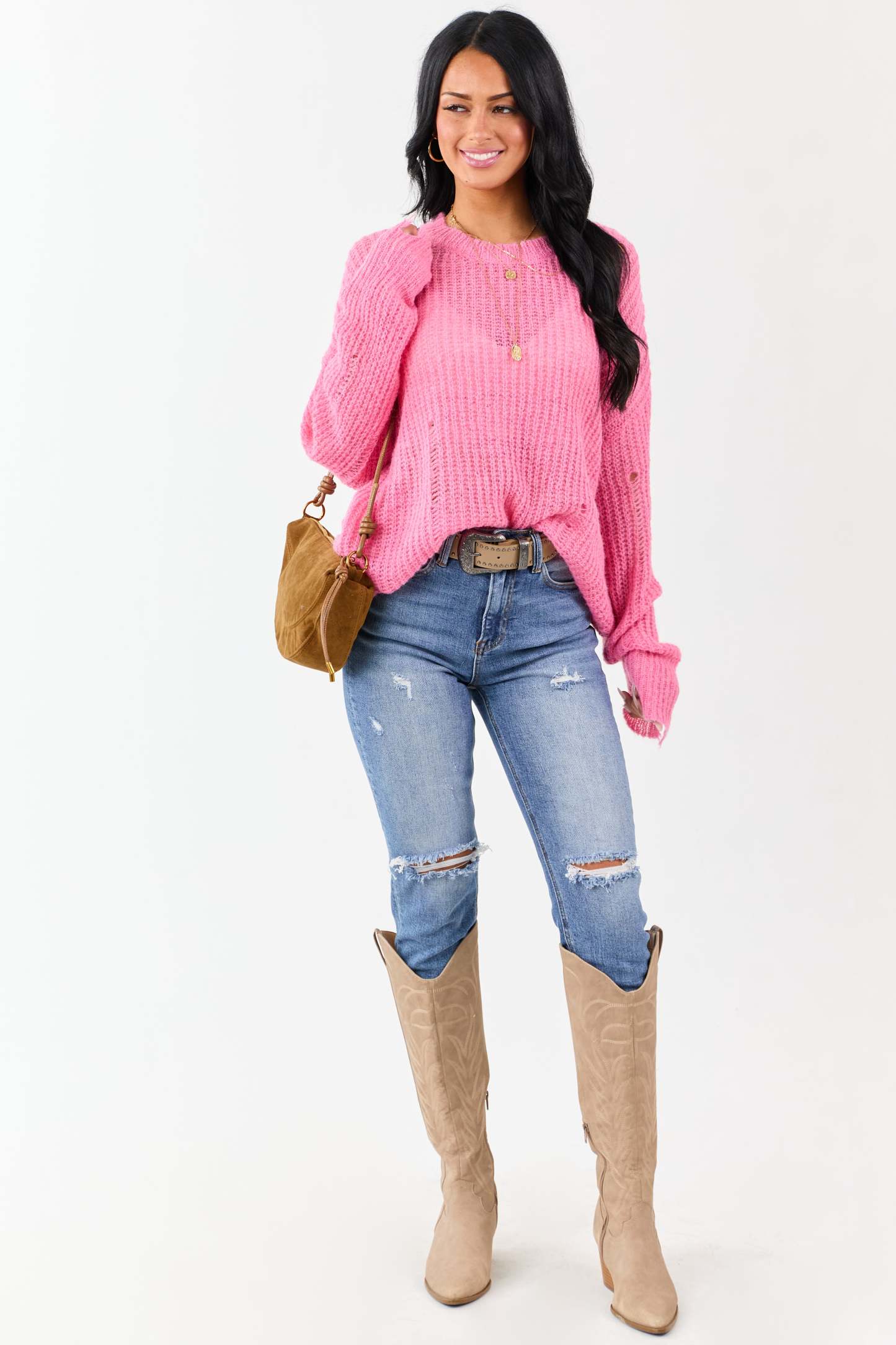 Fuchsia Wool Blend Distressed Ribbed Knit Sweater