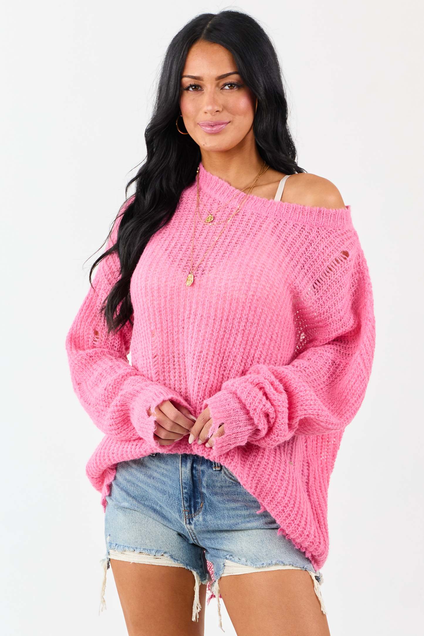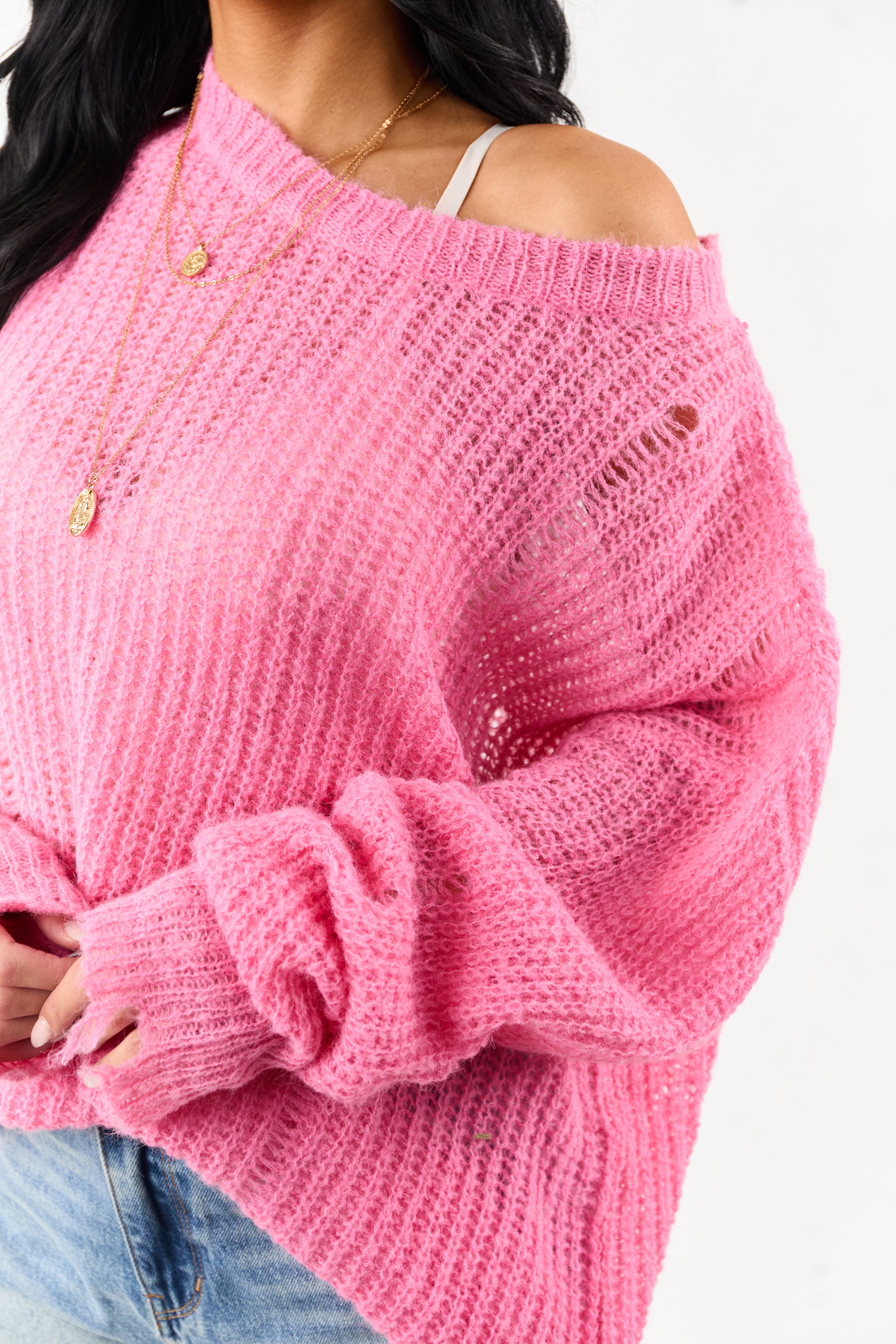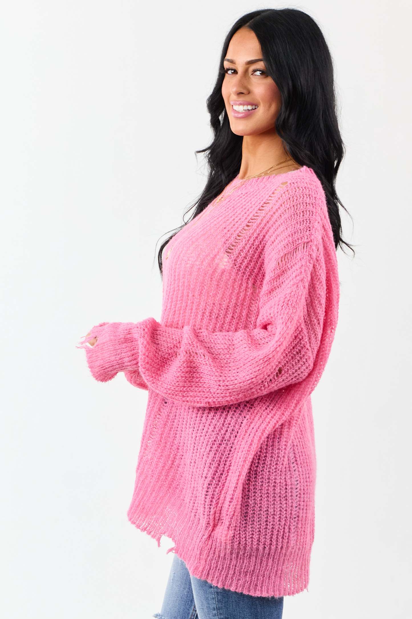 Fuchsia Wool Blend Distressed Ribbed Knit Sweater