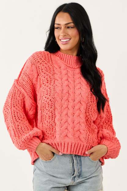 POL Coral Mock Neck Bubble Sleeve Cable Knit Sweater